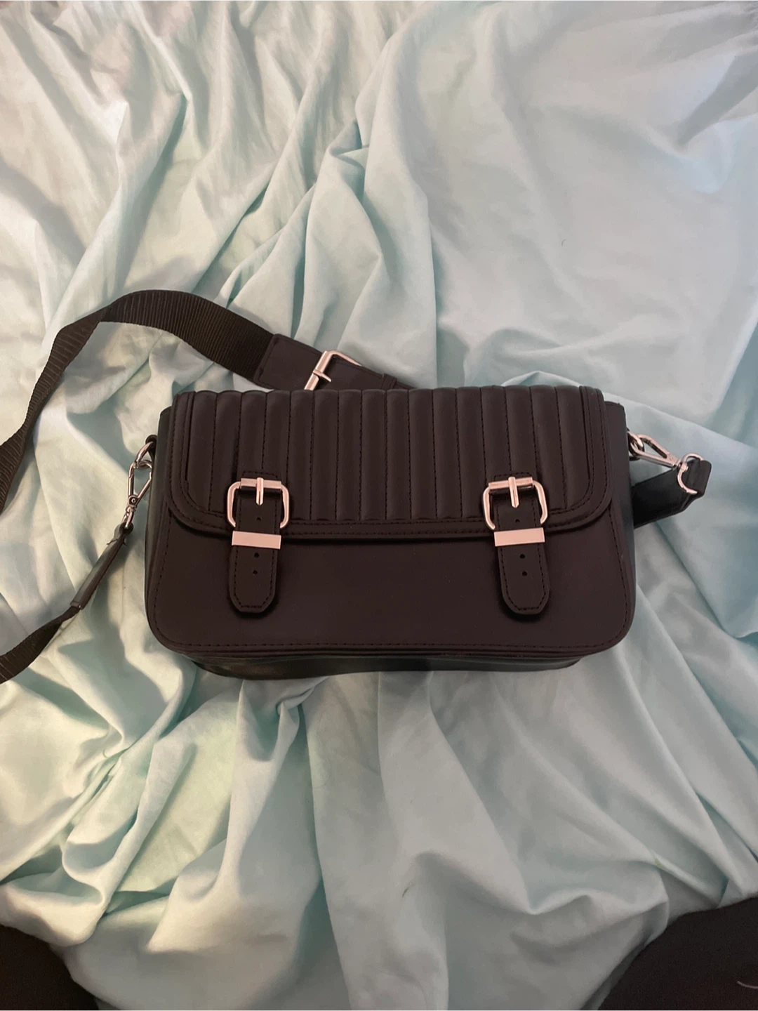 This black shoulder bag features a stylish quilted design with two buckle closures. It's made of faux leather and includes an adjustable strap. The interior has a simple lining with a divider.