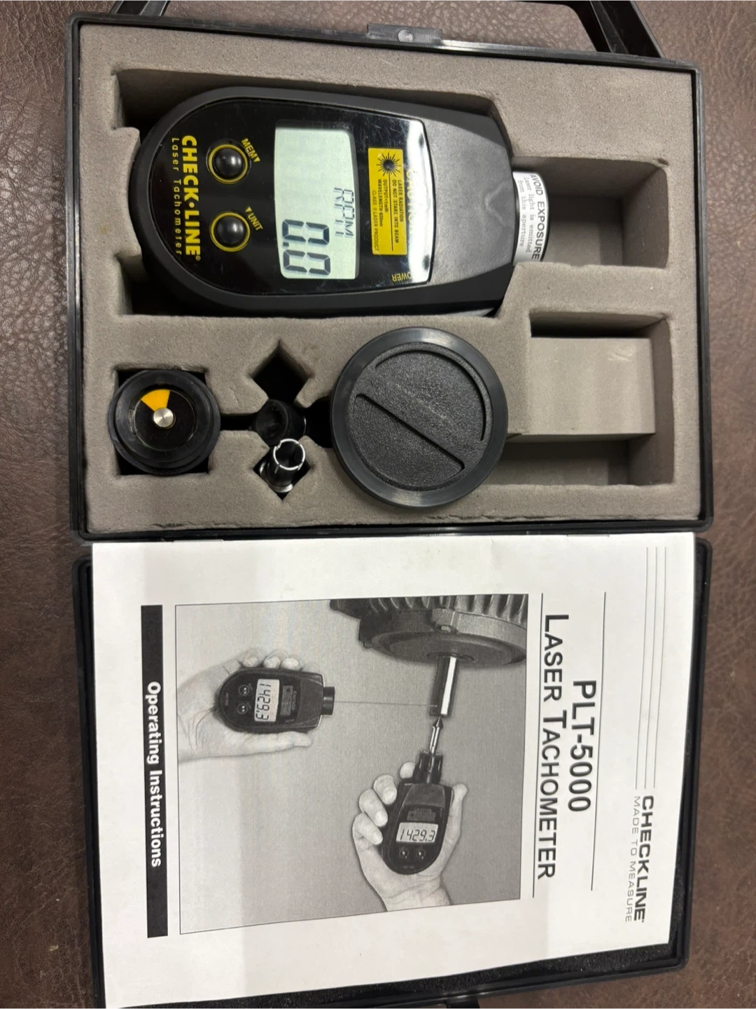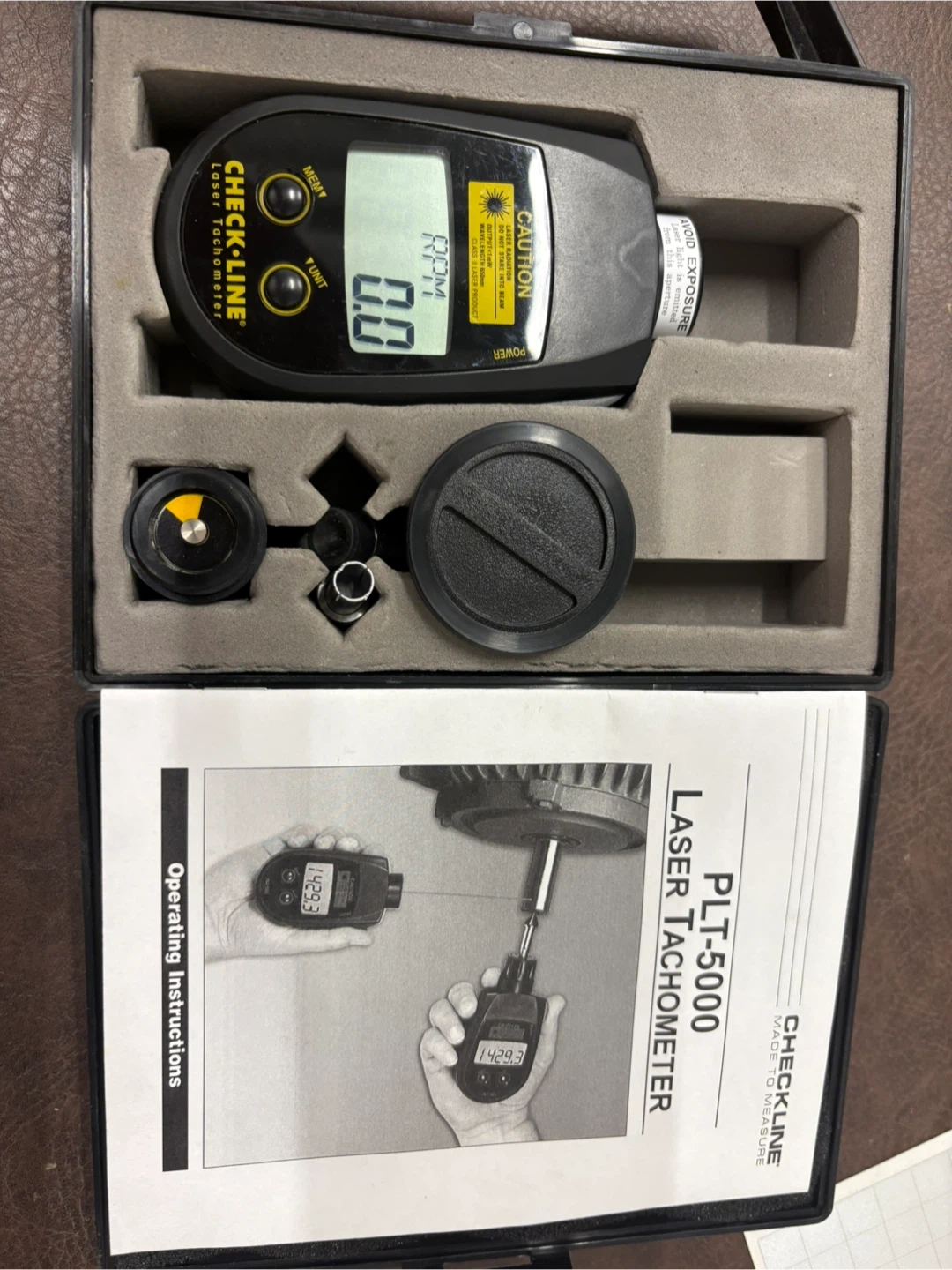CHECK-LINE PLT-5000 Laser Tachometer. Includes operating instructions and accessories in a protective case. Measures RPM using laser detection.