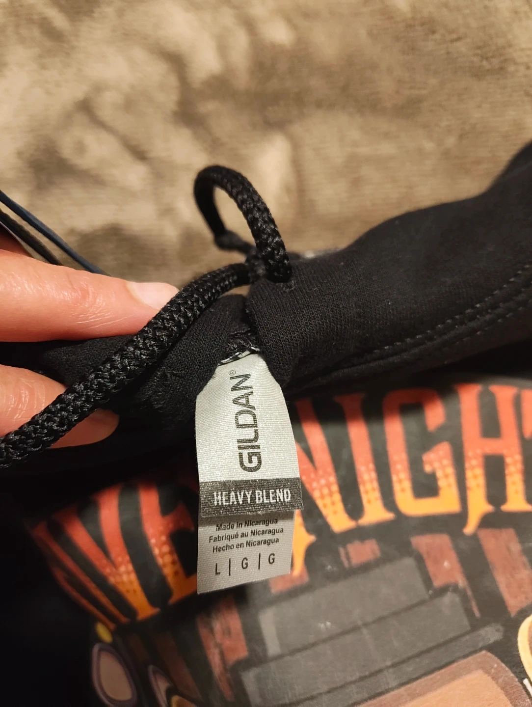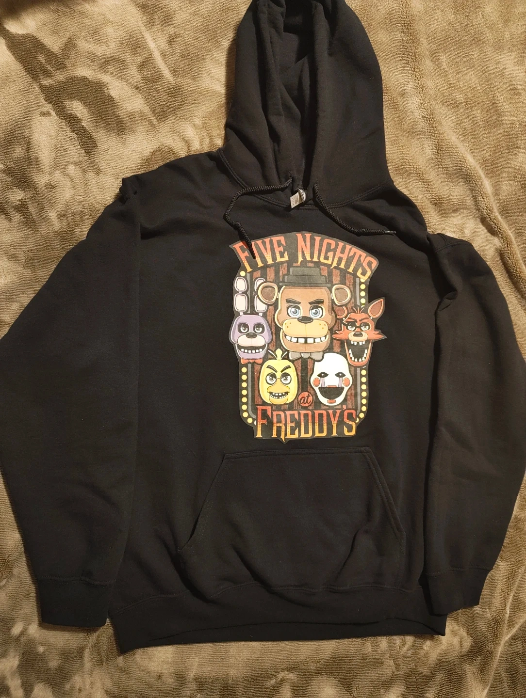 Black Gildan Heavy Blend hoodie with a Five Nights at Freddy's graphic print. Size Large.