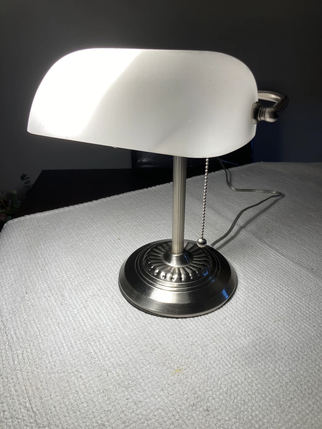 This is a banker's style desk lamp with a frosted glass shade. It has a brushed nickel finish and a pull chain for easy operation. Perfect for illuminating your workspace or bedside table.