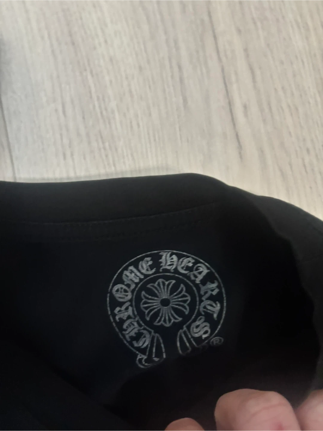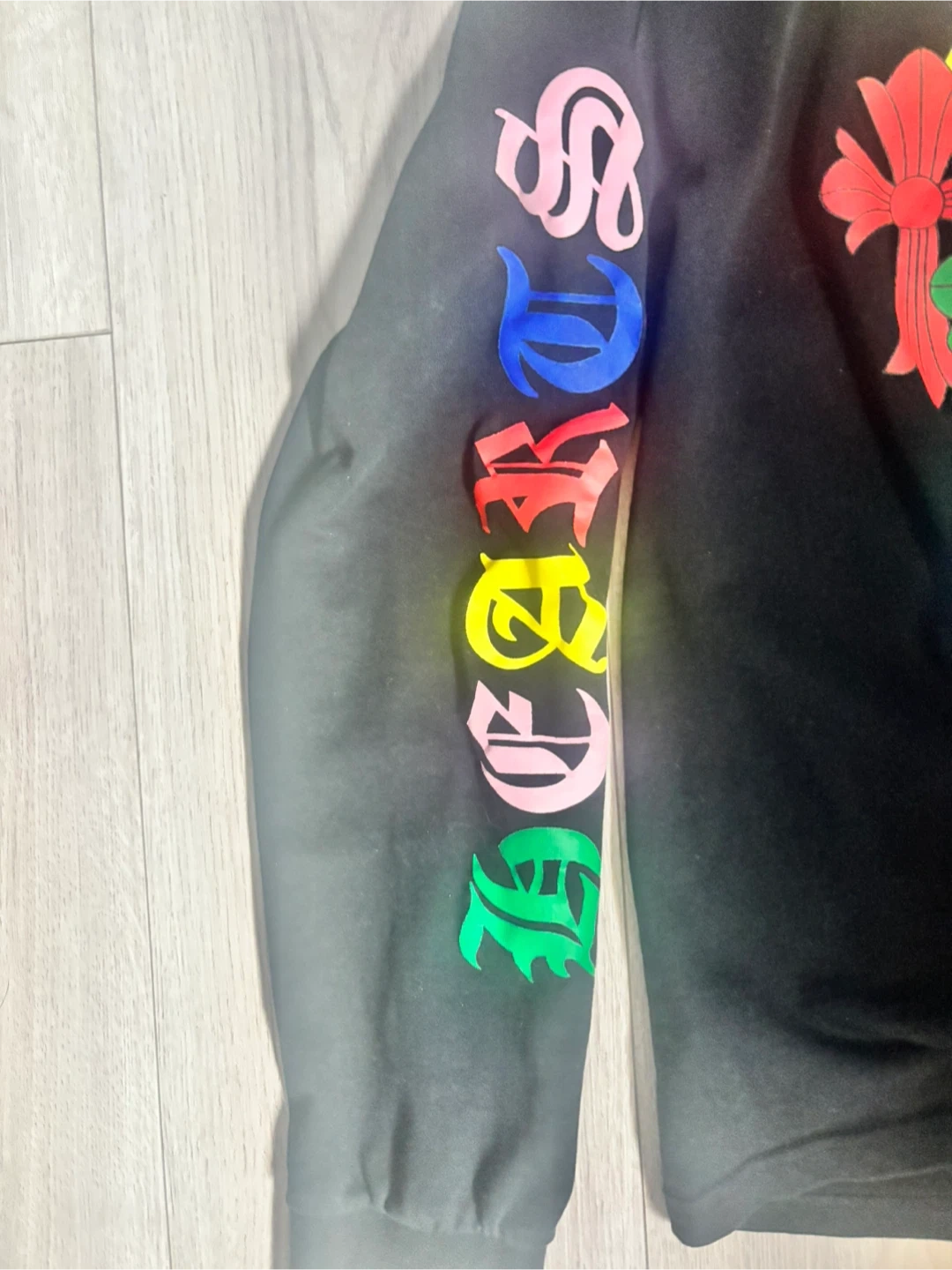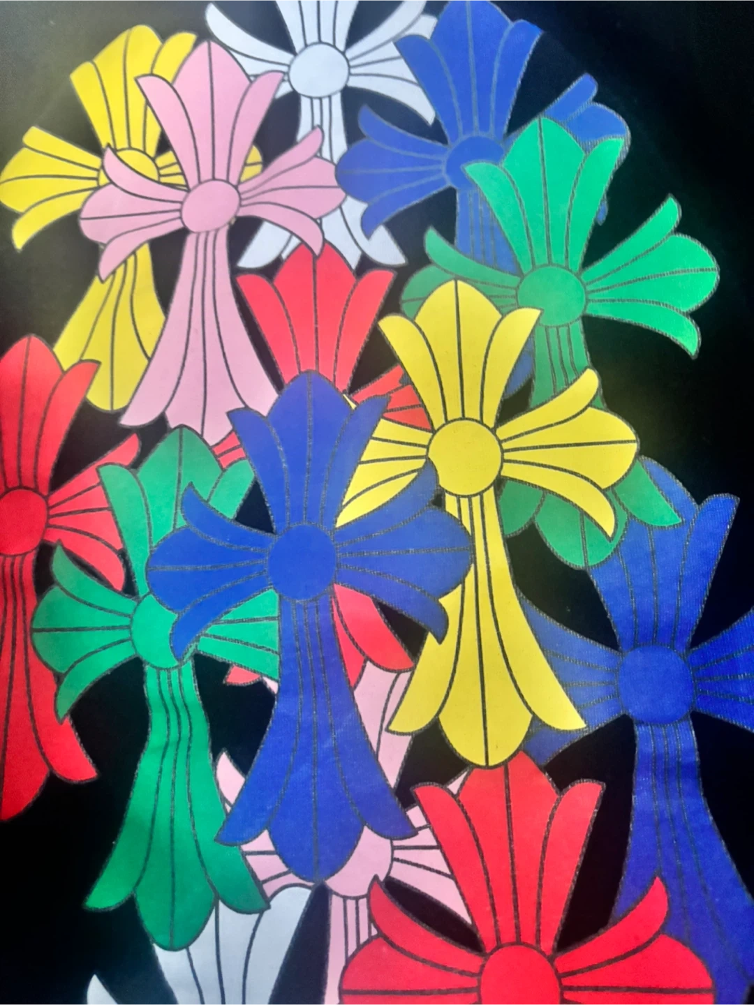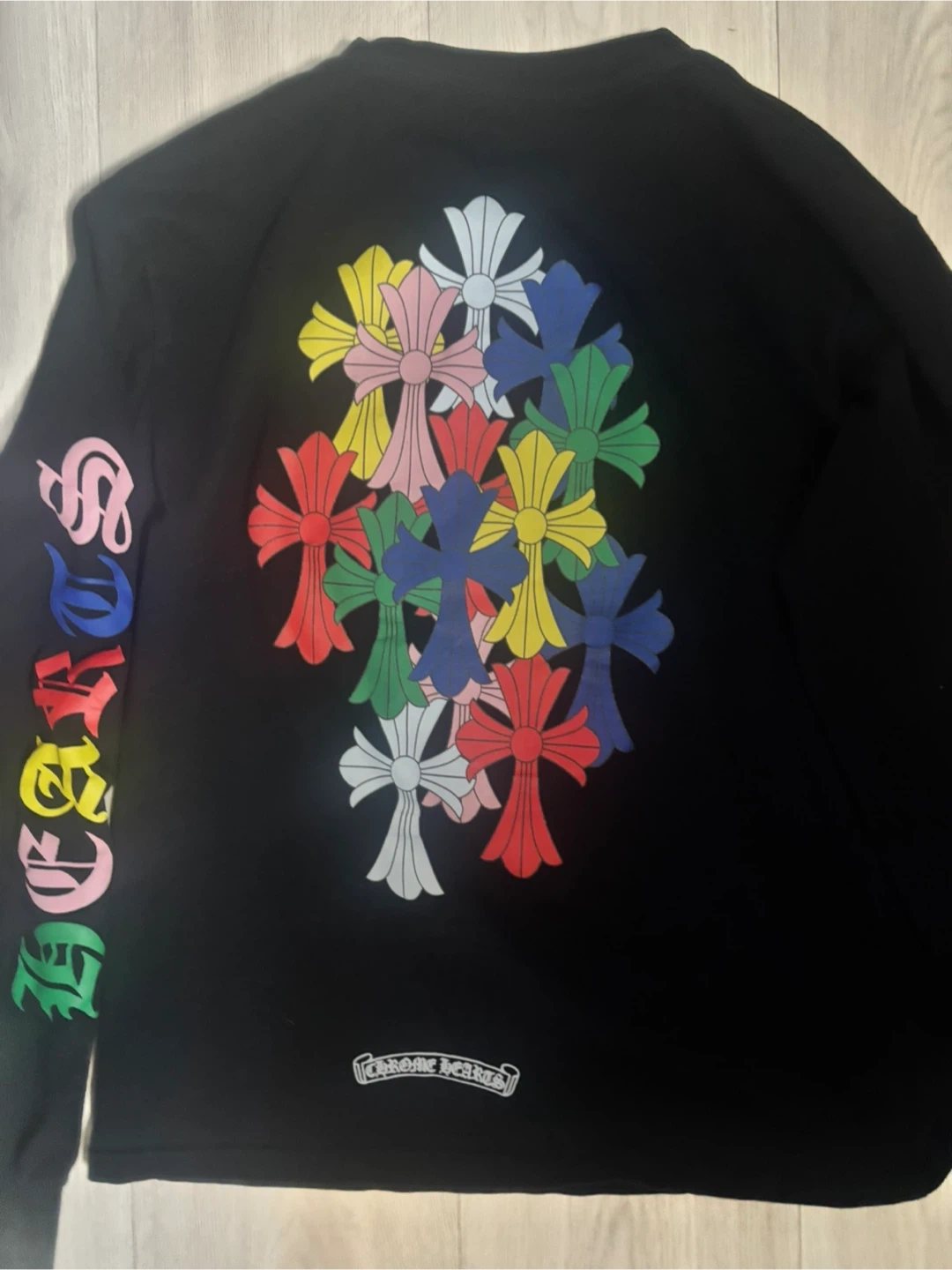 This is a black long sleeve shirt by Chrome Hearts. It features a multicolor cross graphic on the back and sleeve. The shirt is made of cotton.