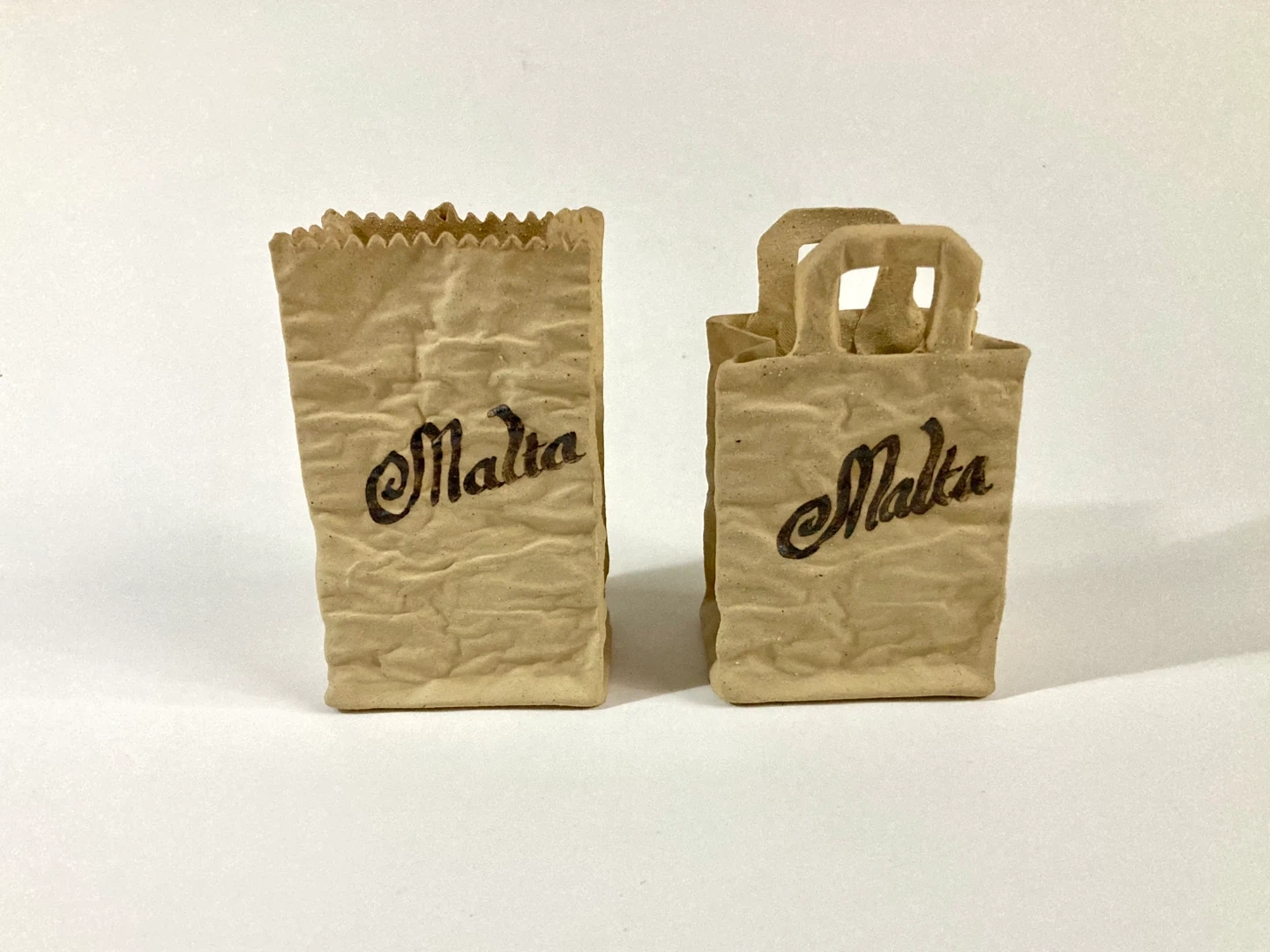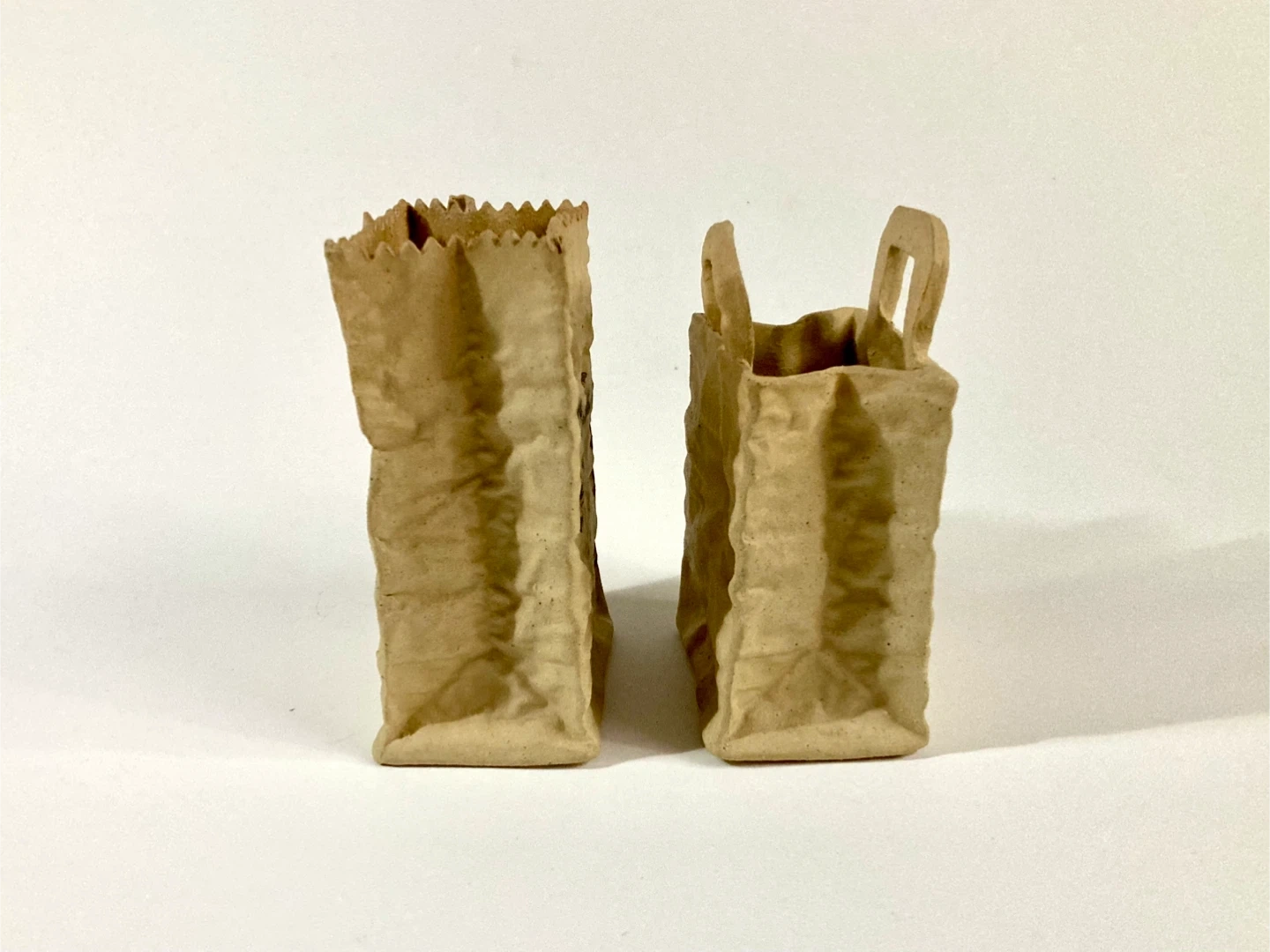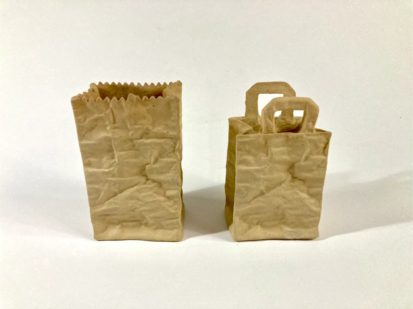 Cute ceramic vessels shaped like paper grocery bags with handles. Price is for the pair. Second picture includes a walnut to show scale.
