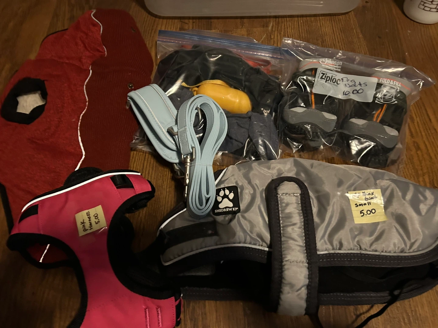 Bundle includes a pink harness and a grey dog jacket, both size small. Also included are dog boots and a light blue leash. All items are in good condition and ready for your furry friend!