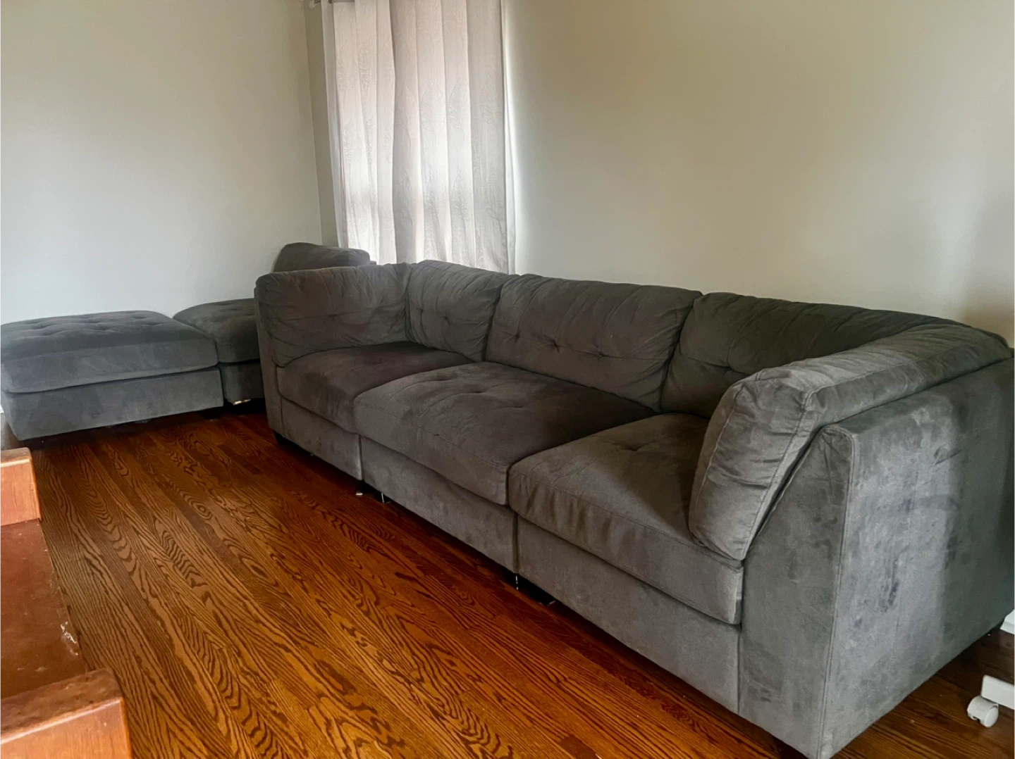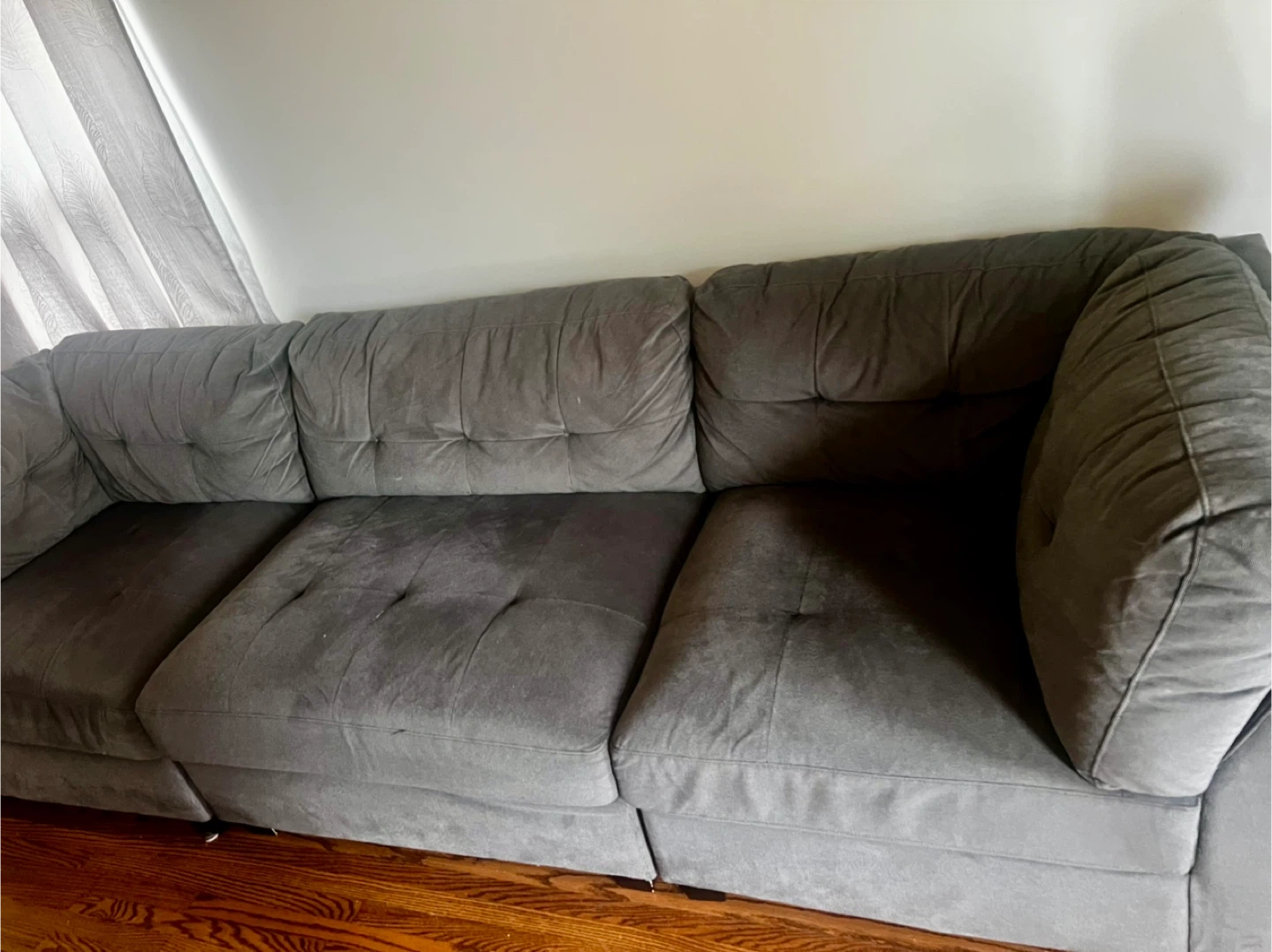 Comfortable soft dark grey sectional sofa with a chaise lounge. Upholstered in a soft fabric with tufted cushions. It's a modular piece that can be rearranged.