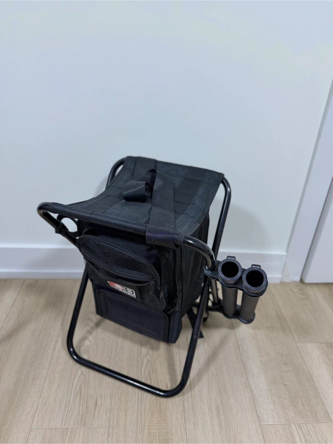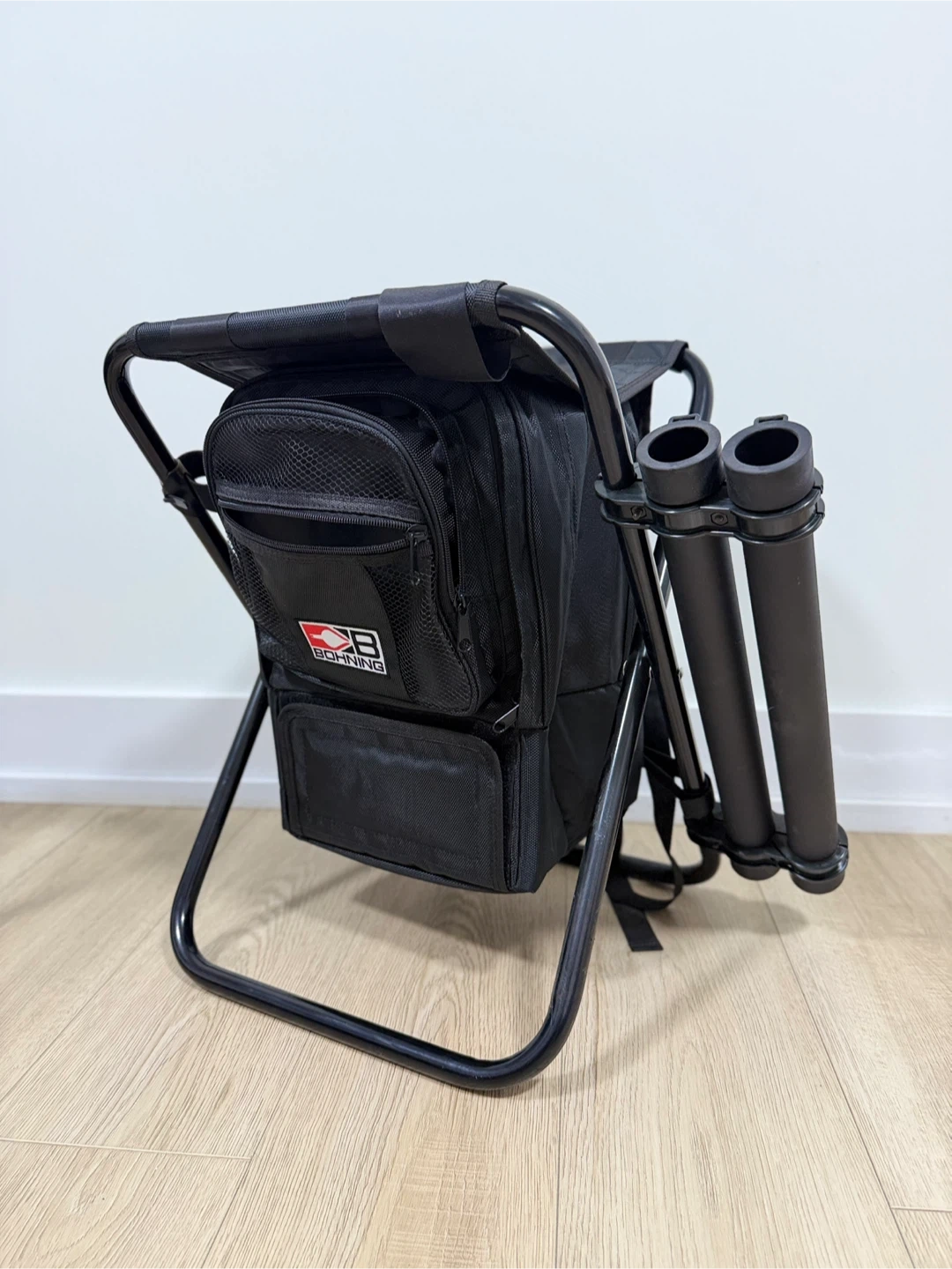 This Bohning stool is black and comes with a convenient backpack. It features a built-in cooler and holders for your equipment. It's perfect for outdoor activities!
