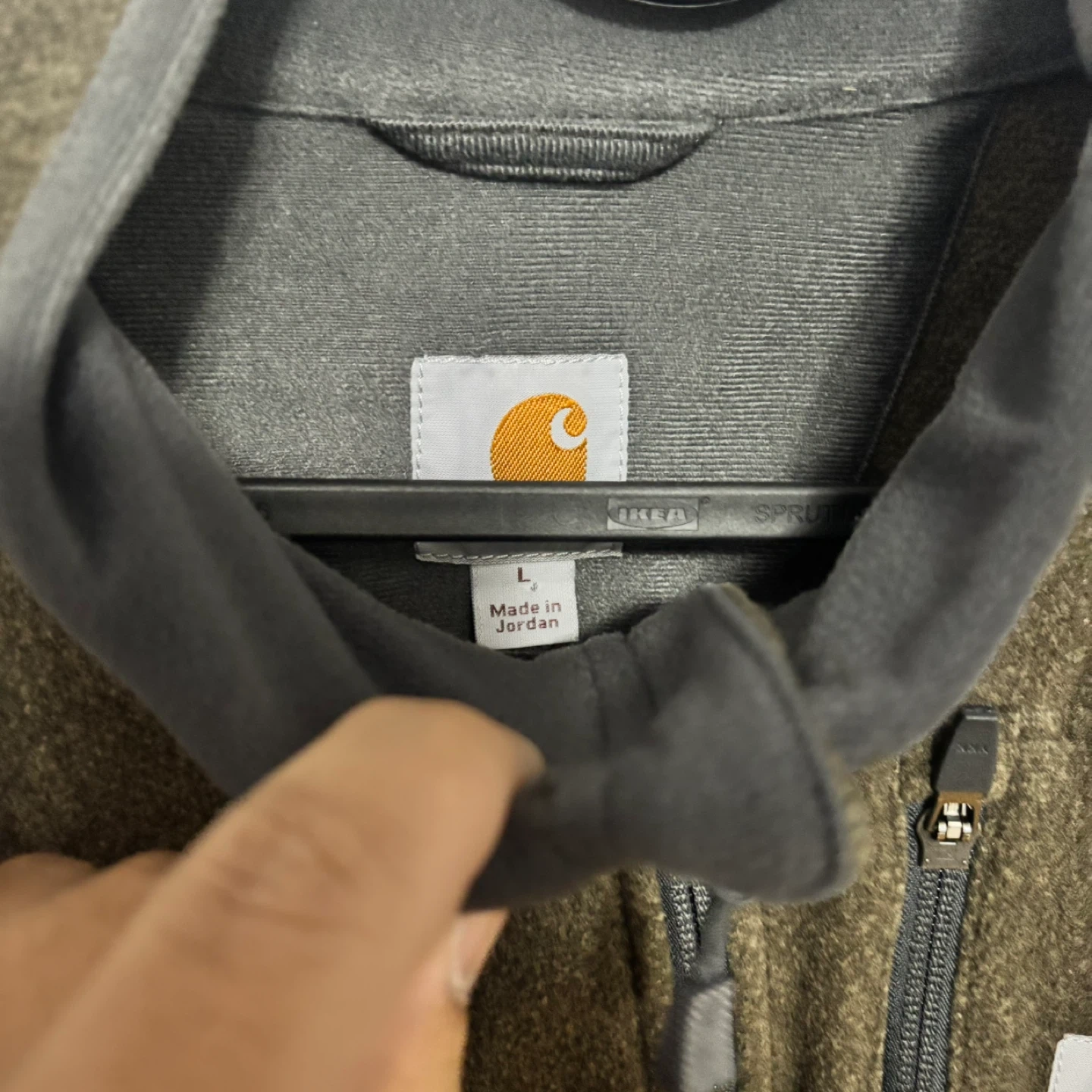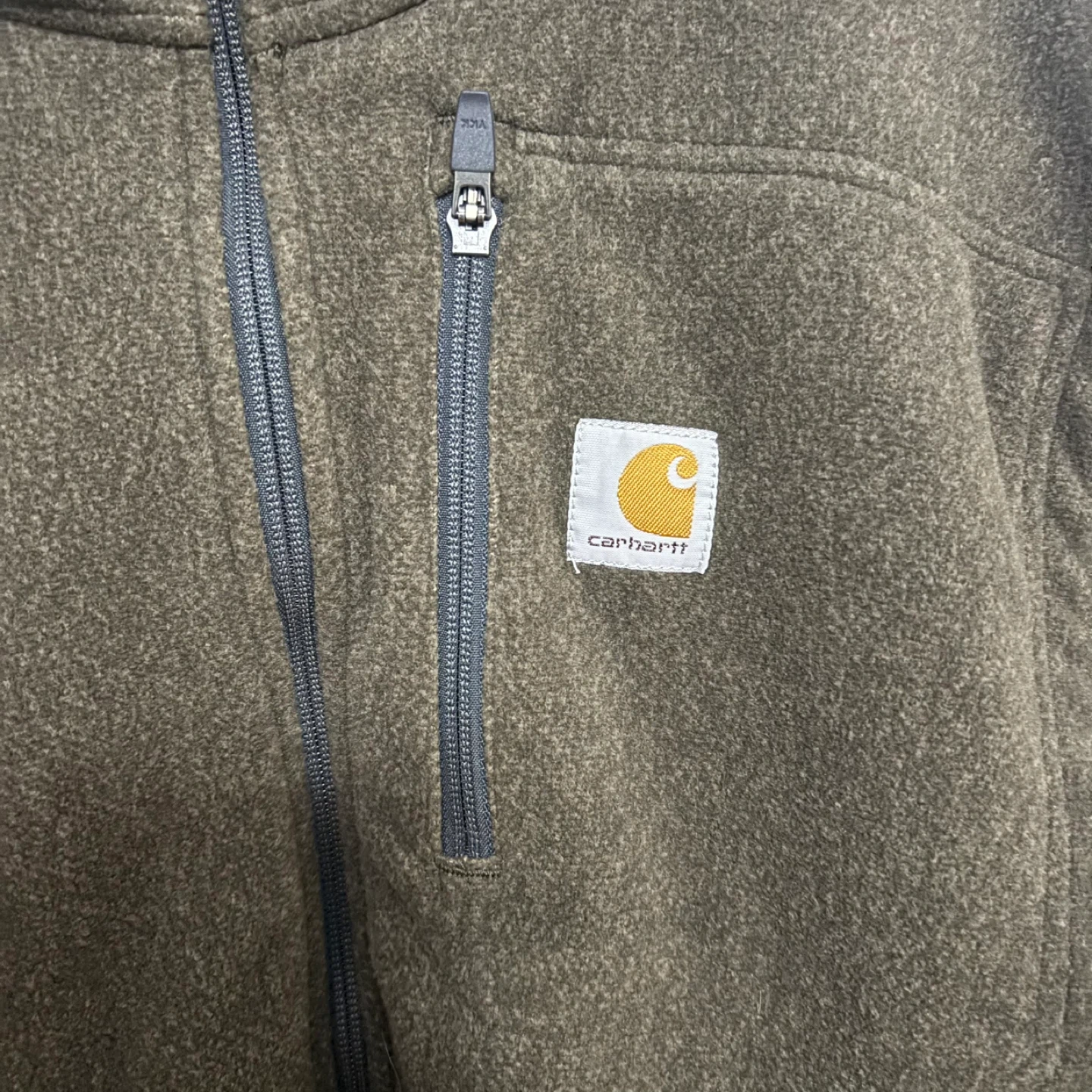 This Carhartt fleece jacket is made of 100% polyester. It's a regular size large in a dark olive green colour. It has a full zip front and zippered pockets.