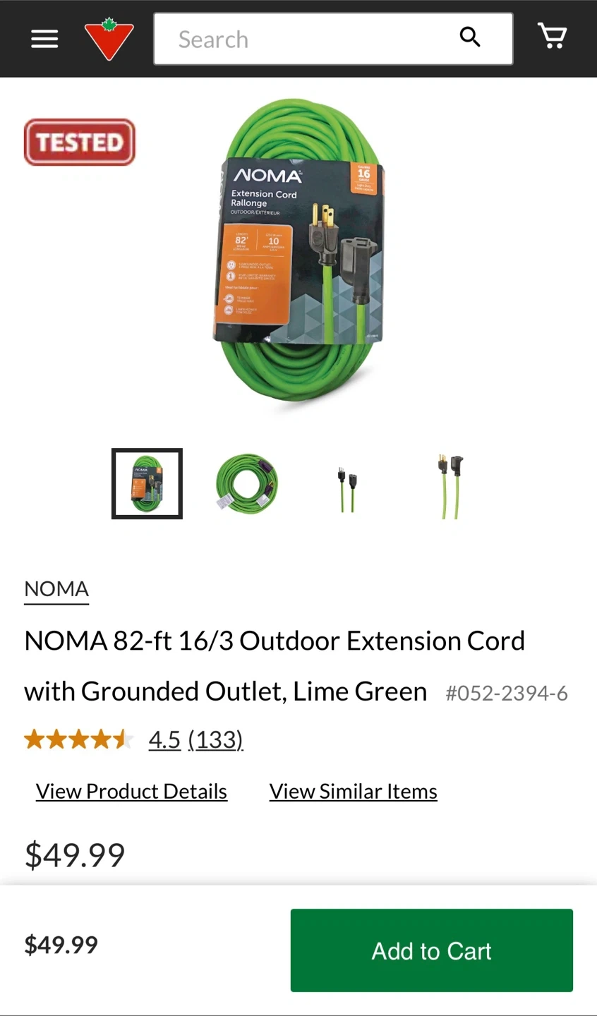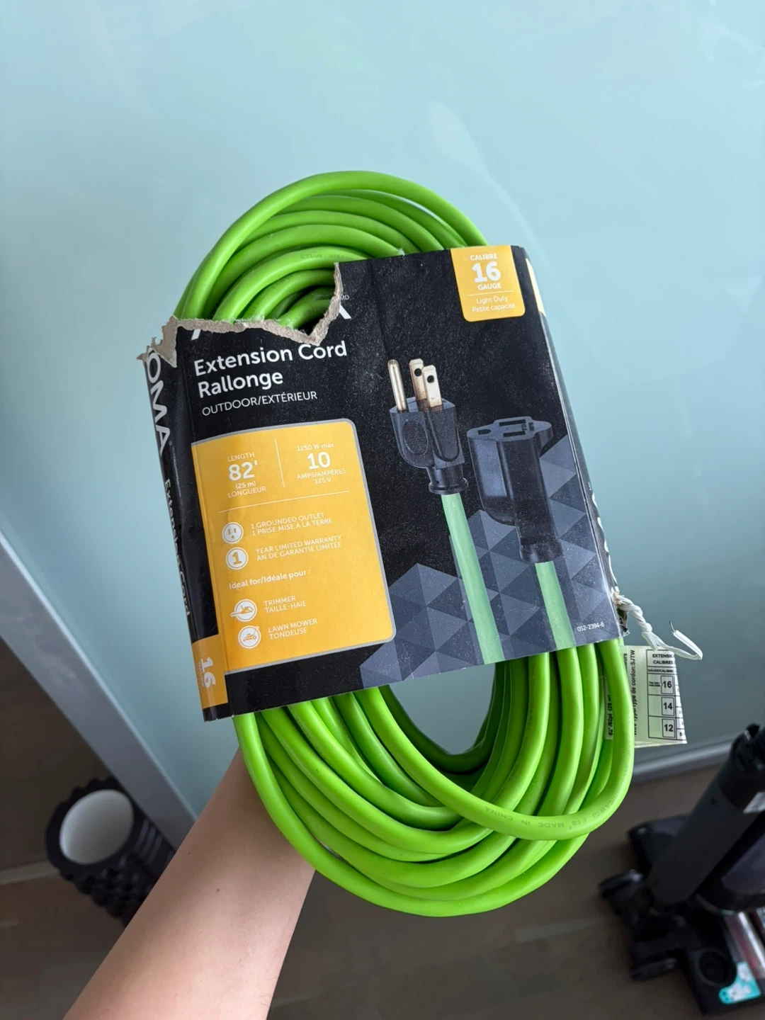 NOMA outdoor extension cord 82 feet long and rated for 16 gauge. It's a 10 amp, 125 volt cord with a grounded outlet. It's built for outdoor use, perfect for lawn equipment like mowers. Never used, my dog ripped off a little bit of the packaging but actual cable is fine