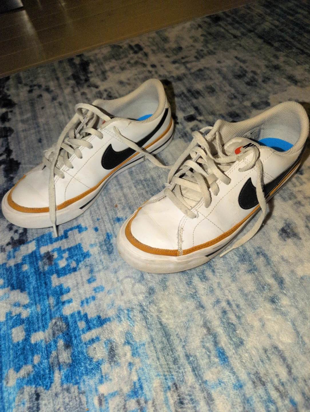 These are a pair of white boys' size 6Y genuine Nike sneakers with black and orange accents. They feature a classic lace-up design. These kicks are great for everyday wear or indoor recess! The soles are brand new inside because the original ones wore out.