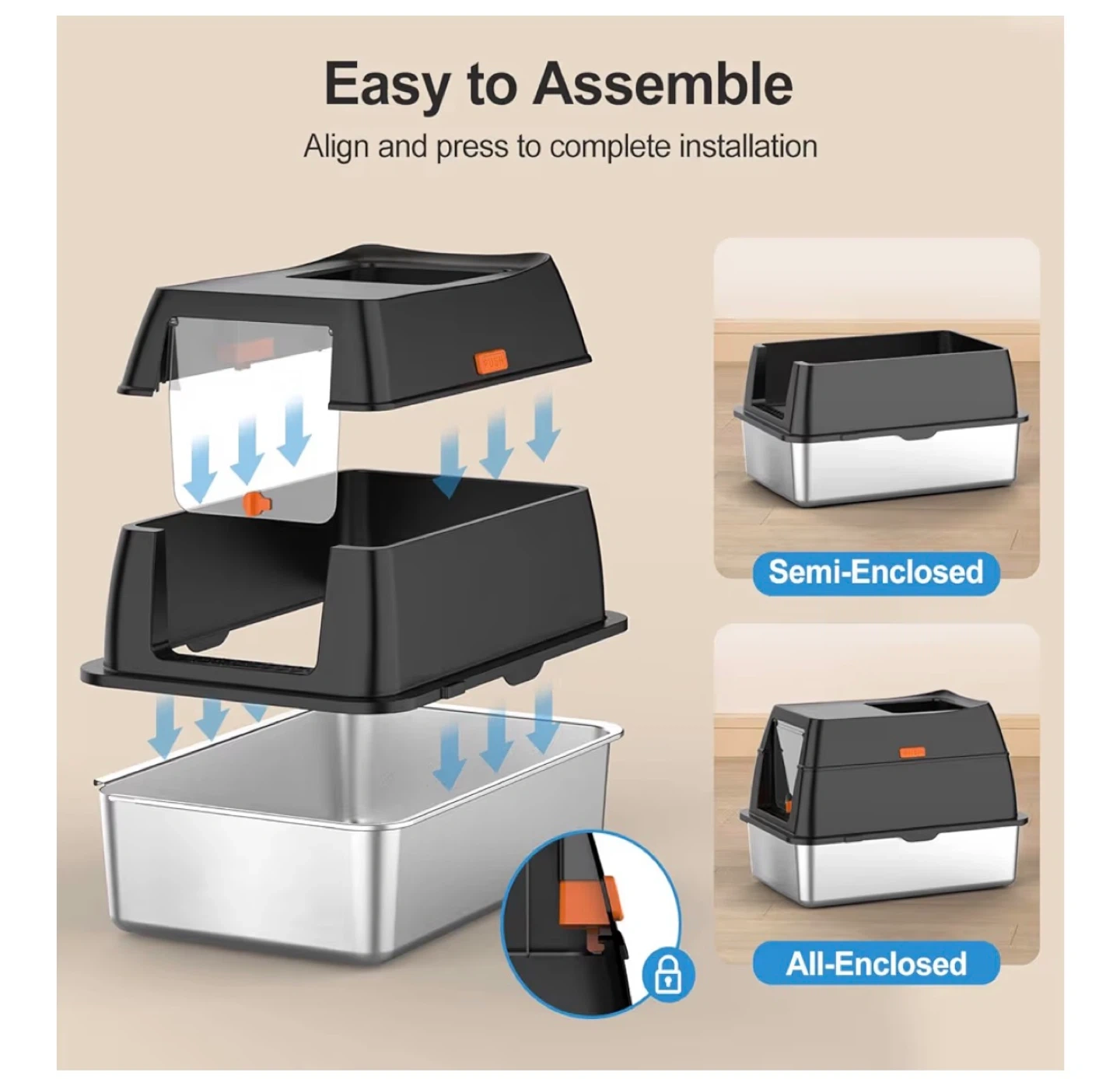 This enclosed litter box offers a semi-enclosed or all-enclosed option for your cat. It's designed for easy assembly and comes with