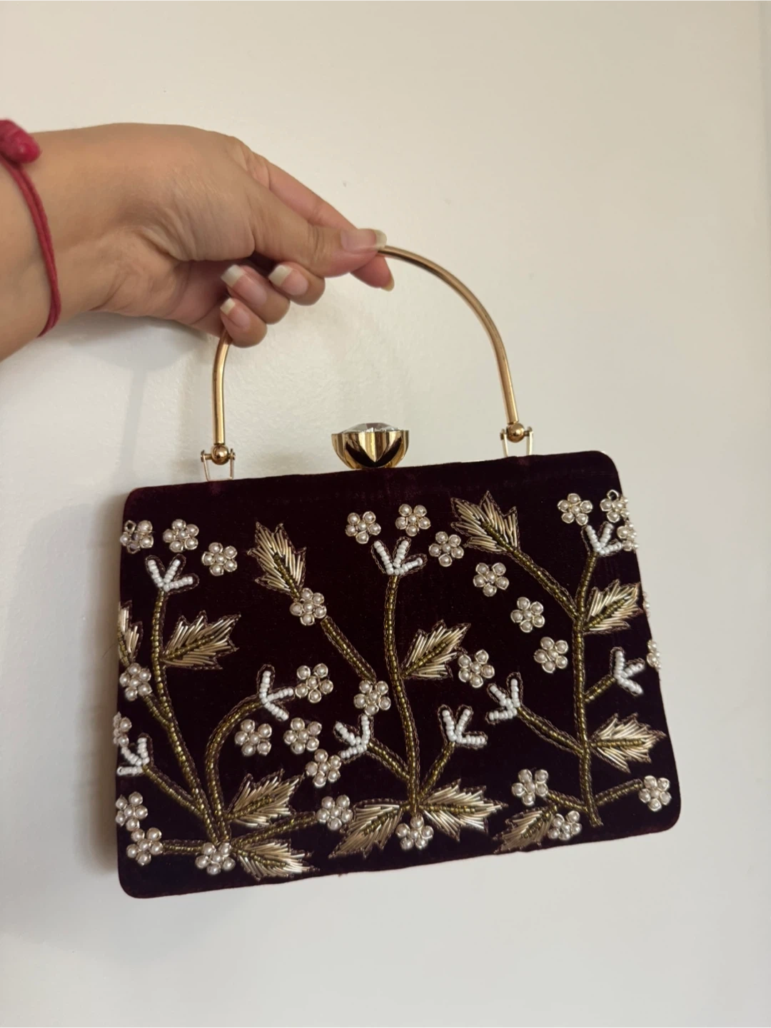 Brand new maroon velvet clutch purse, never used. Beautiful statement piece with pearl and gold floral embroidery and a gold metal handle. Perfect for weddings, parties, festive events, and traditional outfits.