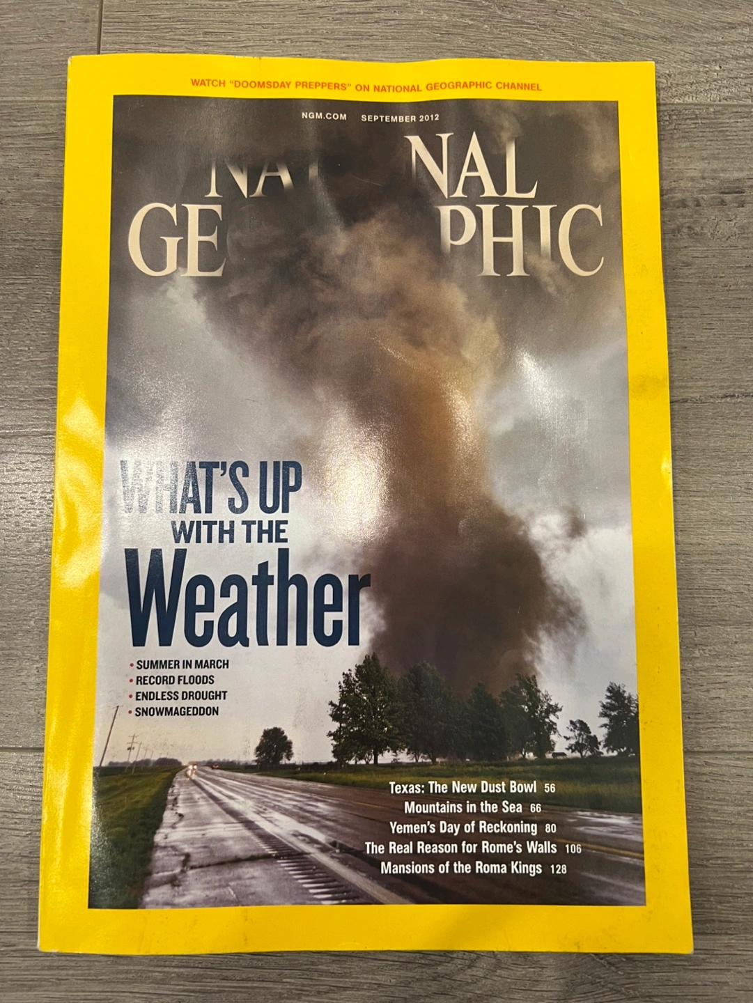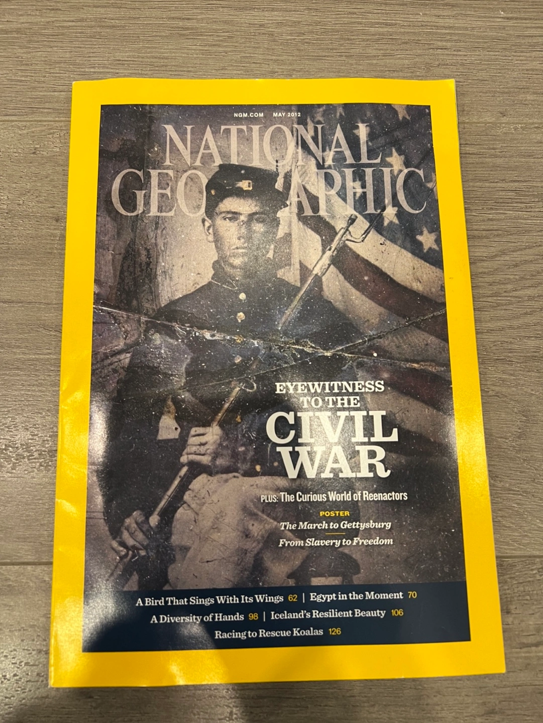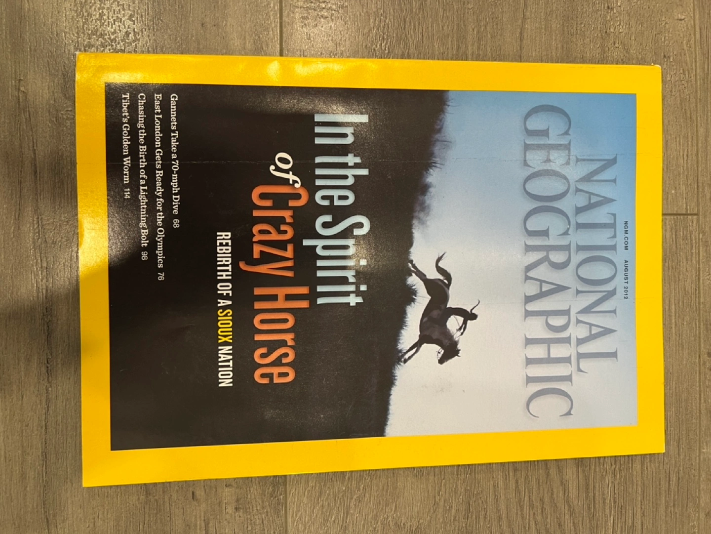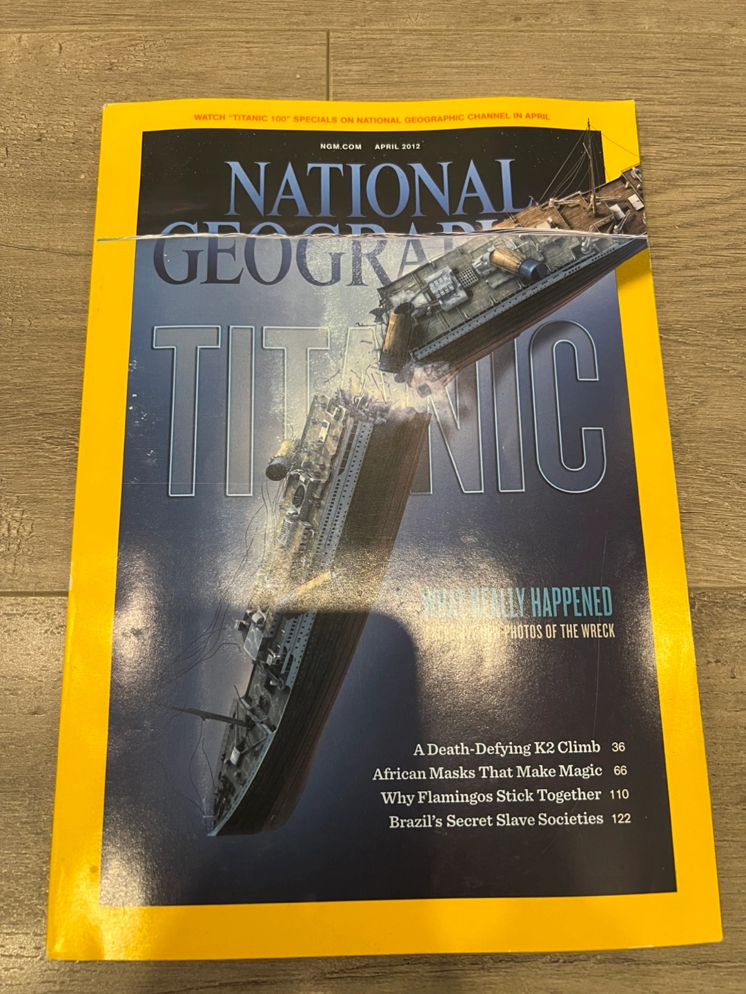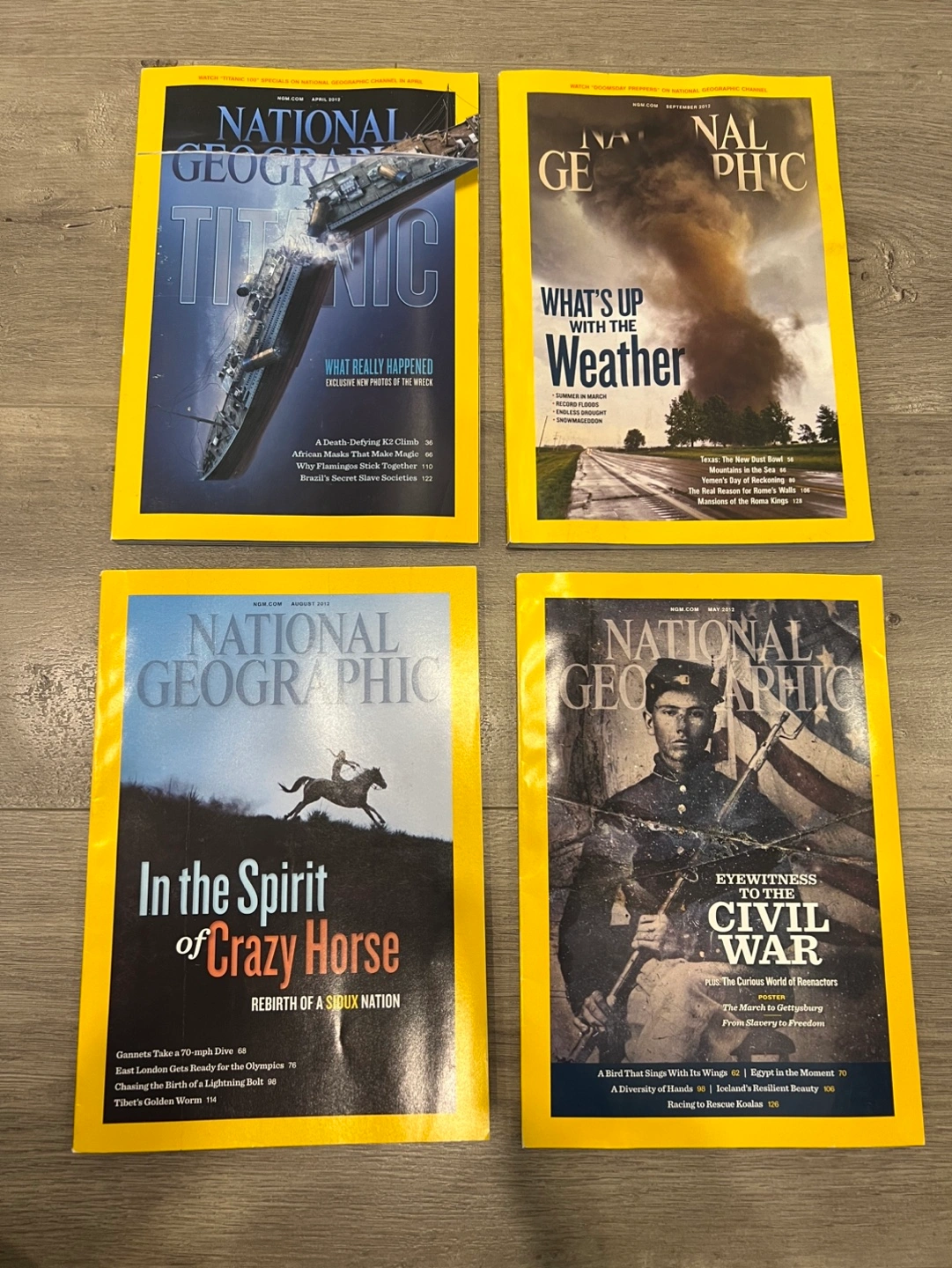 Four collectible National Geographic magazines. Issues include: April 2012 Titanic, May 2013 Civil War, August 2013 Crazy Horse, and April 2012 What's Up With the Weather. Great condition.