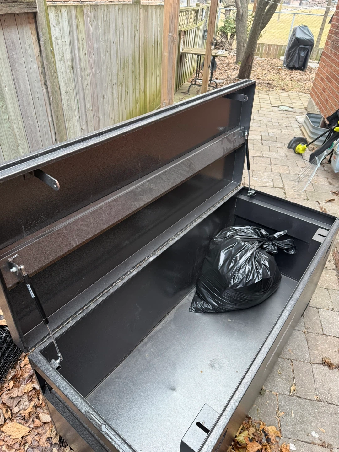This is a POWERFIST outdoor storage box. It's made of durable material and has a hinged lid. Plenty of space for storing cushions or garden tools.