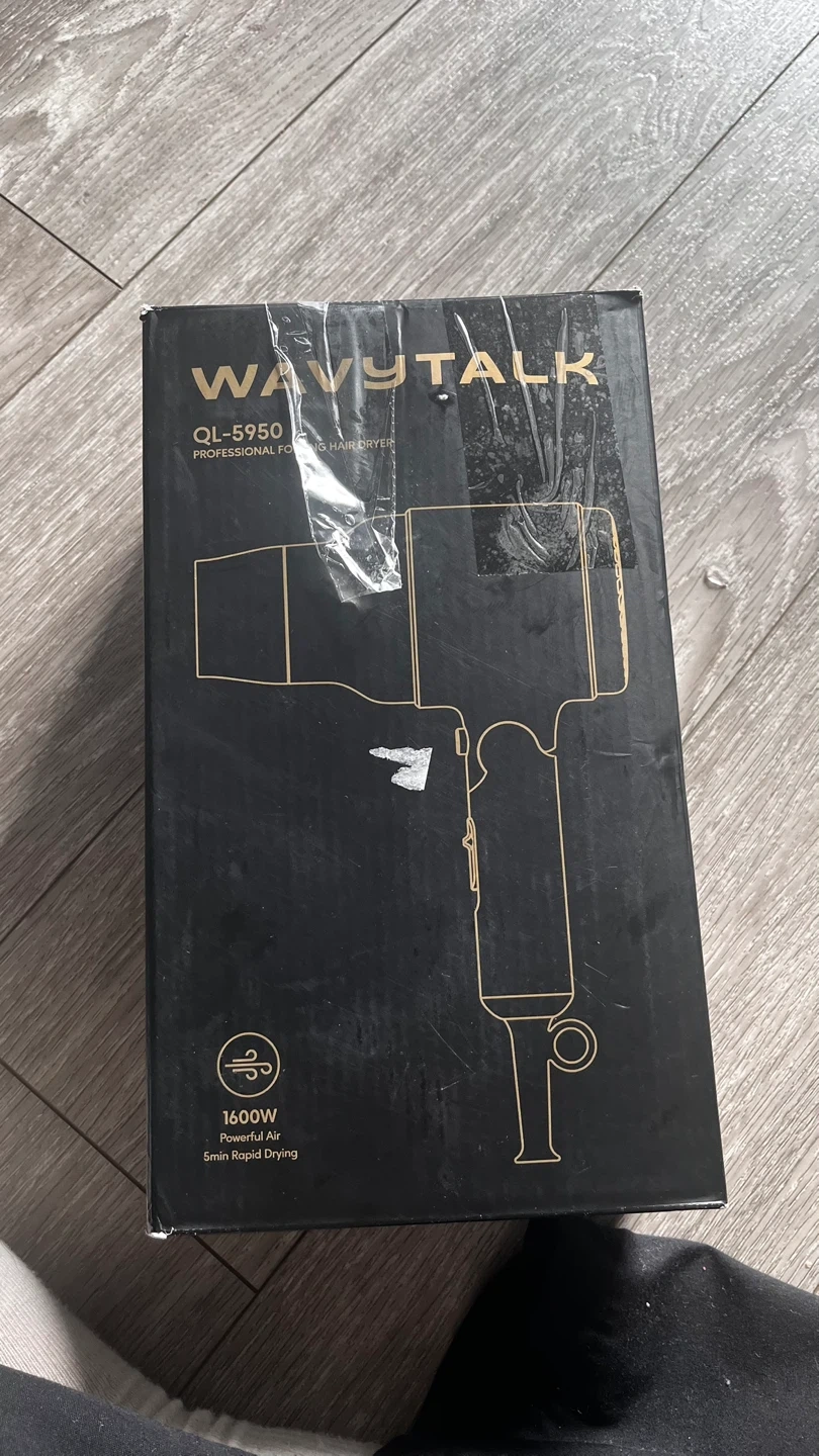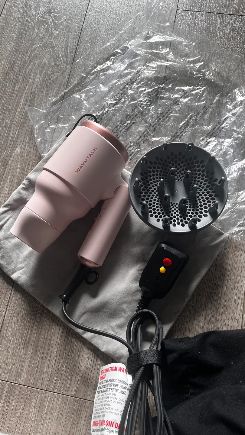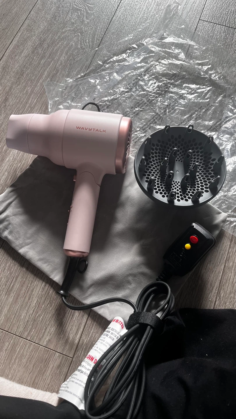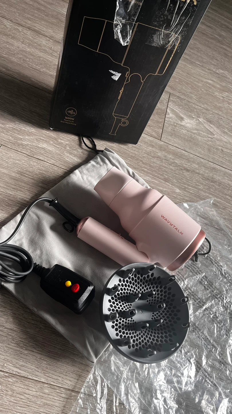 This is a pink Wavytalk QL-5950 professional ionic hair dryer. It comes with a diffuser attachment and a storage bag. The dryer has 1600W of power for rapid drying. Includes original box.