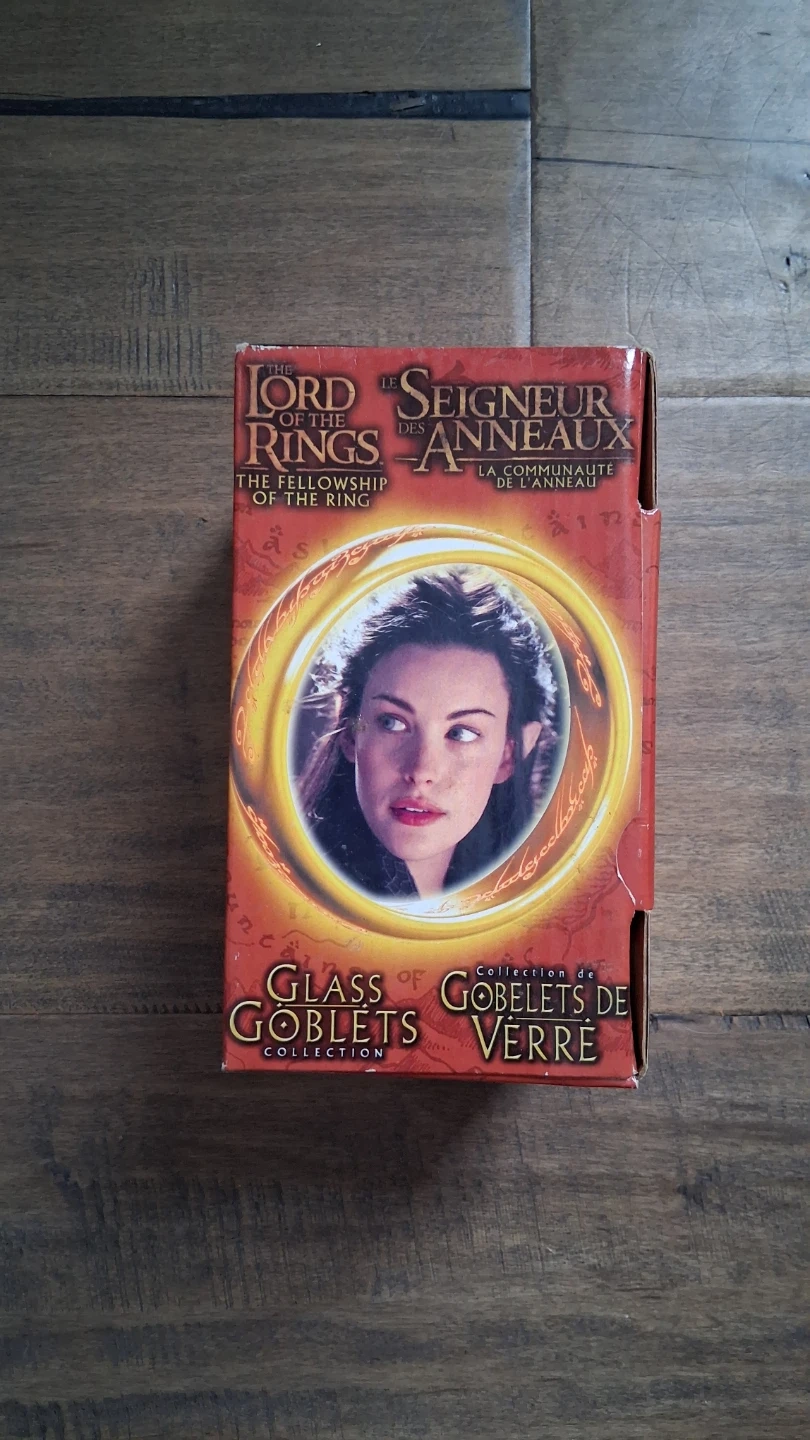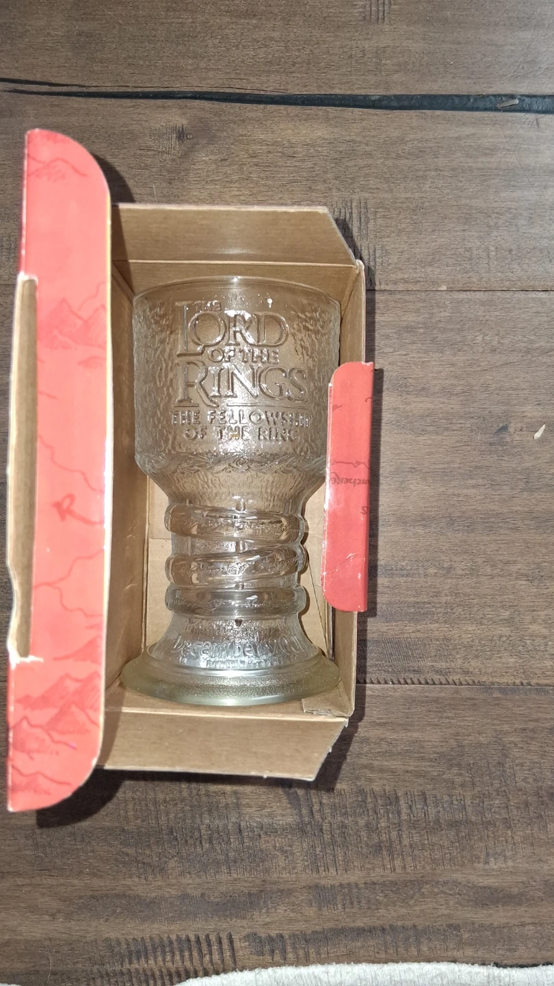 Glass goblet from The Lord of the Rings: The Fellowship of the Ring collection. Embossed with "Lord of the Rings The Fellowship of the Ring". Includes original box. Perfect for fans of the series!