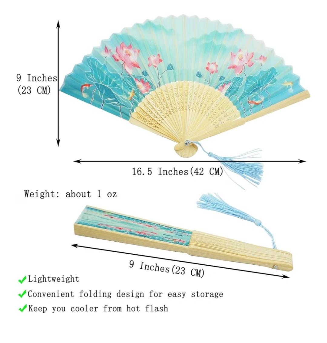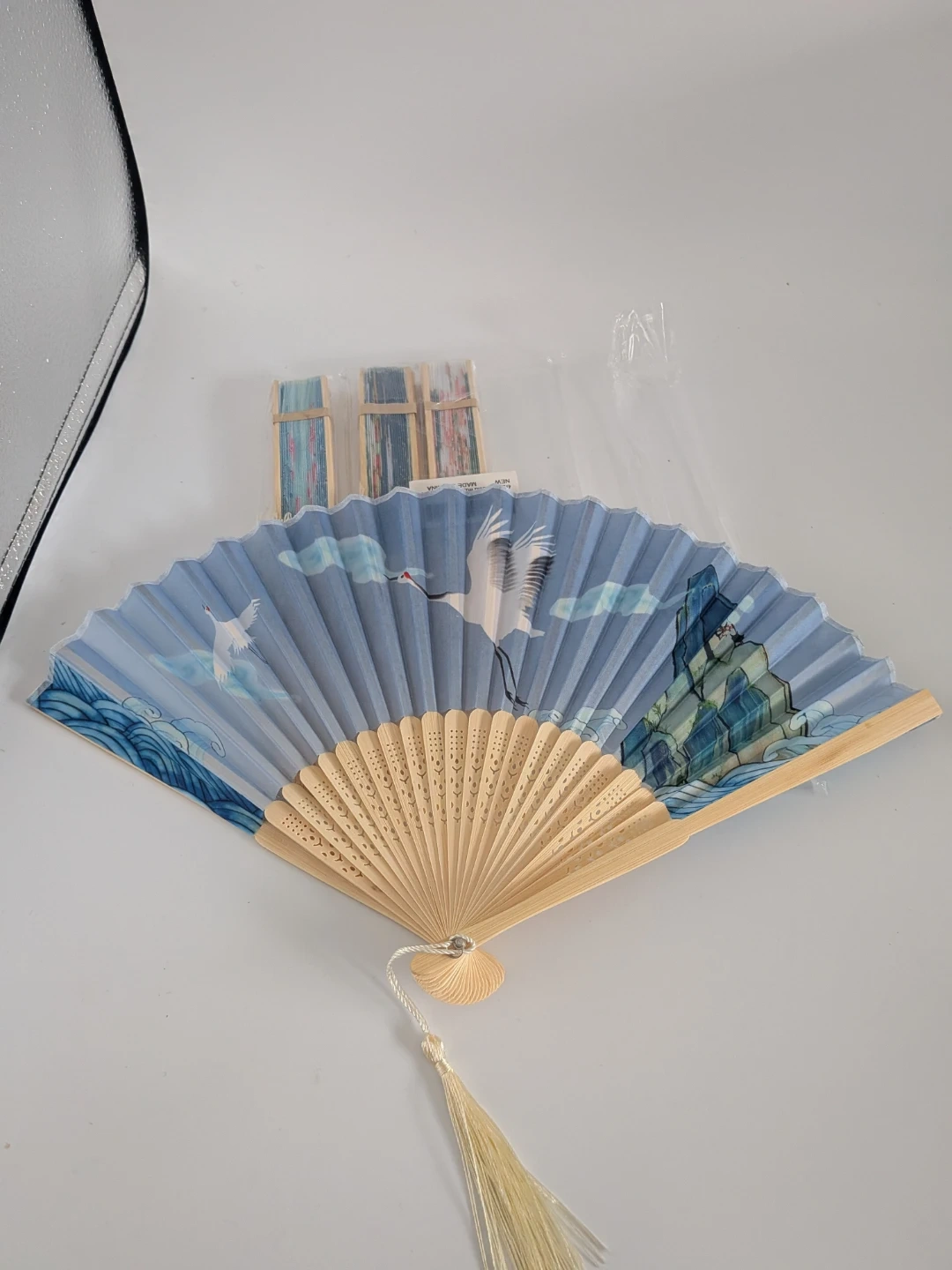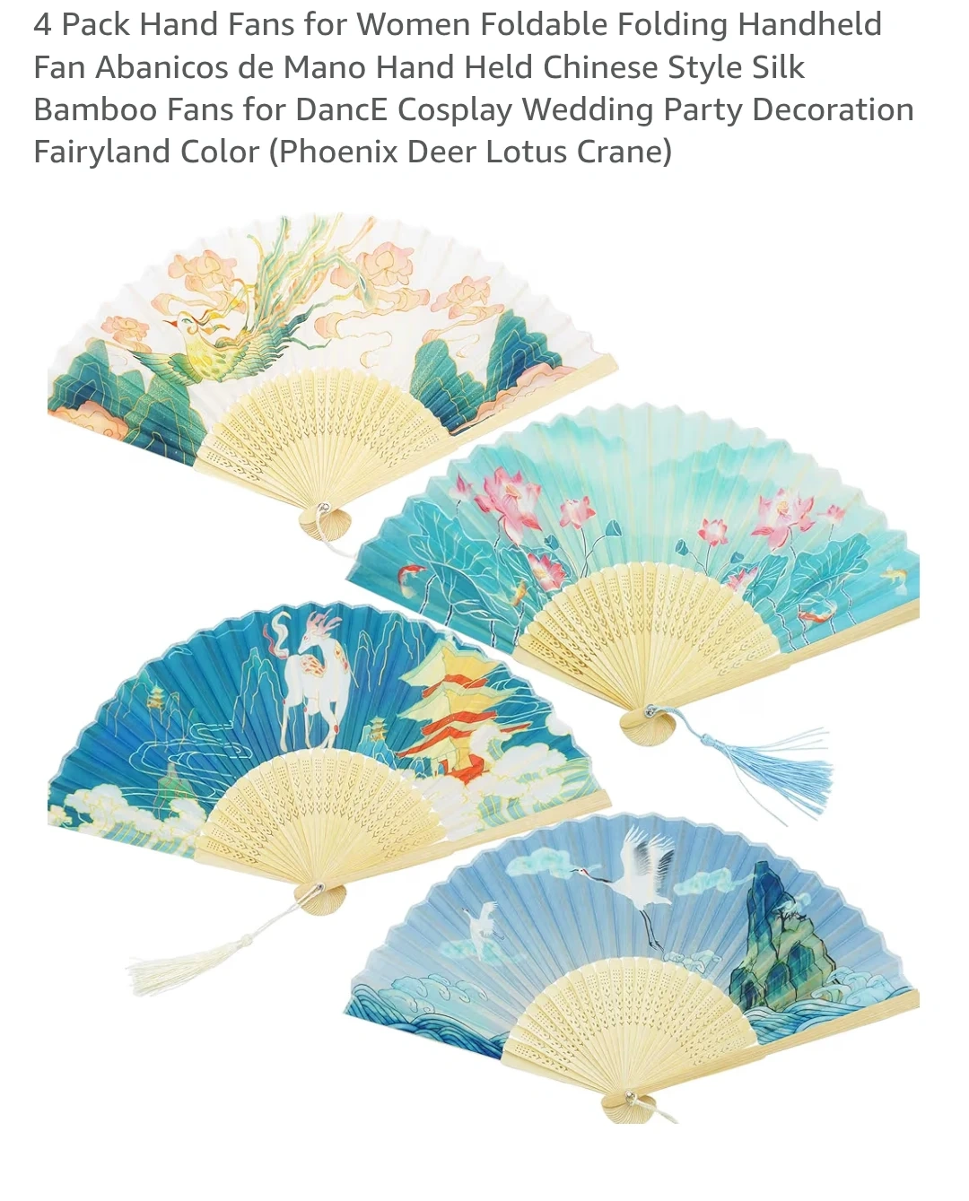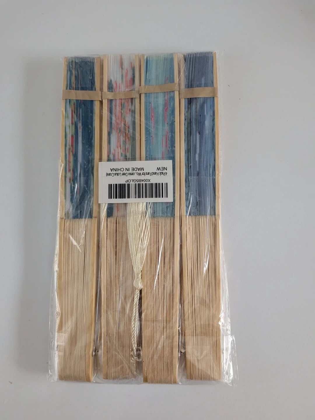 This set includes four foldable hand fans with Chinese-style designs. Each fan is made with bamboo frames and fabric that showcases traditional patterns. They're lightweight and convenient for easy storage, perfect for keeping cool on warmer days.