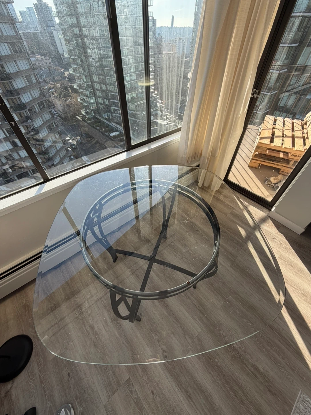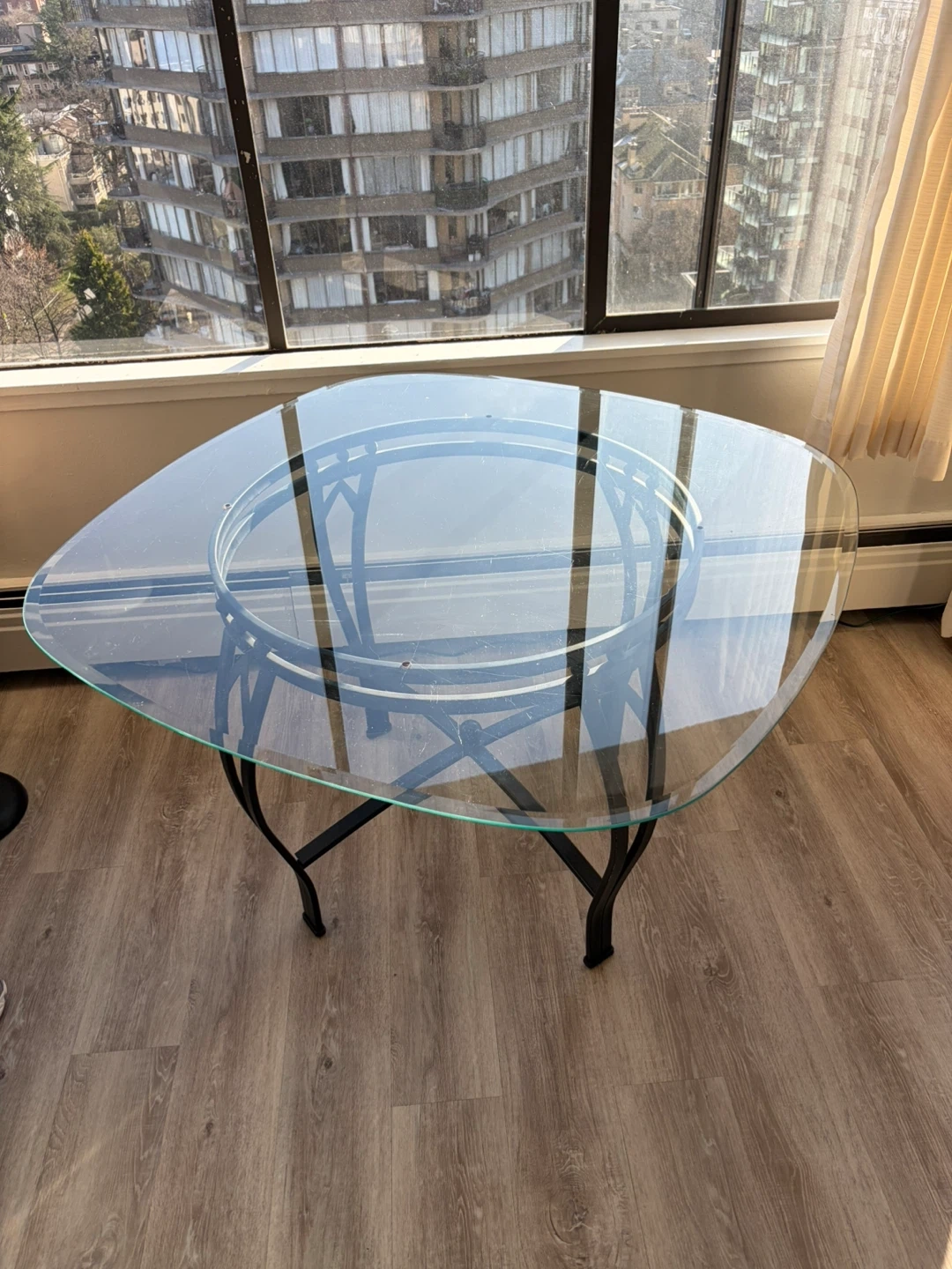 This is a unique glass-top indoor/outdoor dining table with a stylish black metal base. It features a curved, asymmetric glass top and a sturdy, decorative metal frame. It's great for smaller dining areas or as an accent piece.