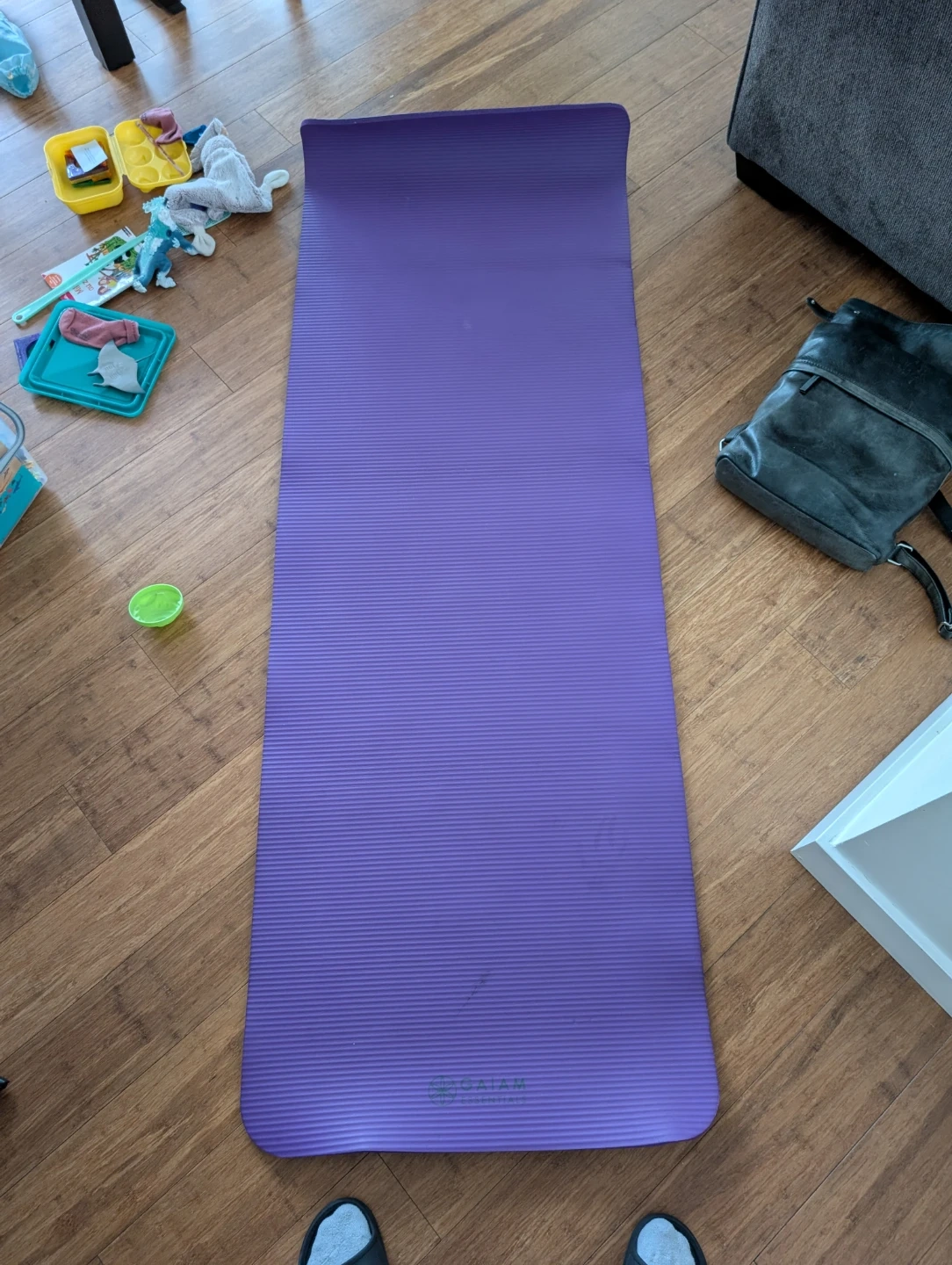 This Gaiam yoga mat is purple and designed for your workouts. It has a ribbed texture for grip. It's great for yoga or other floor exercises.