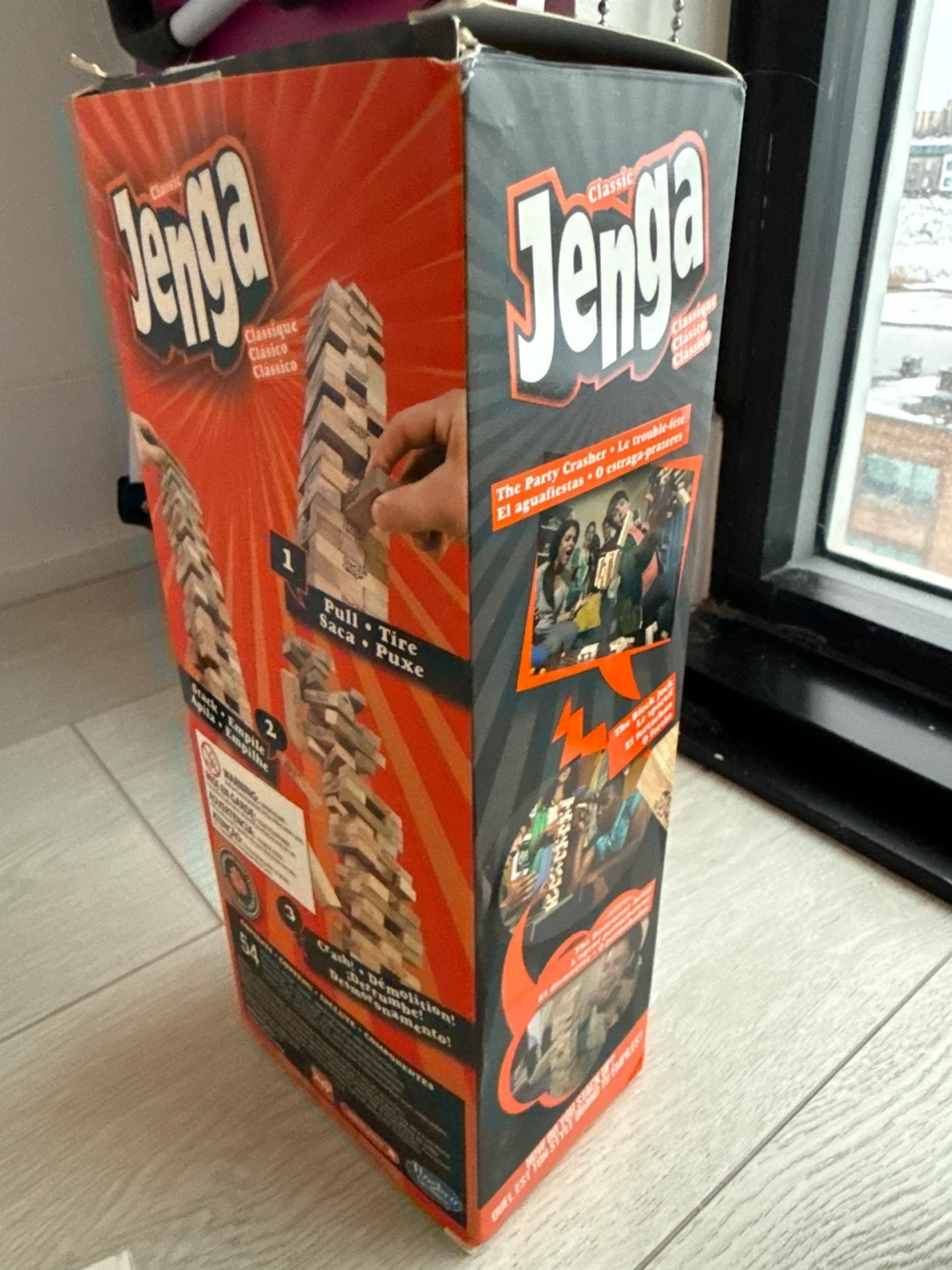 Classic Jenga party game for family fun. It includes 54 wooden blocks.