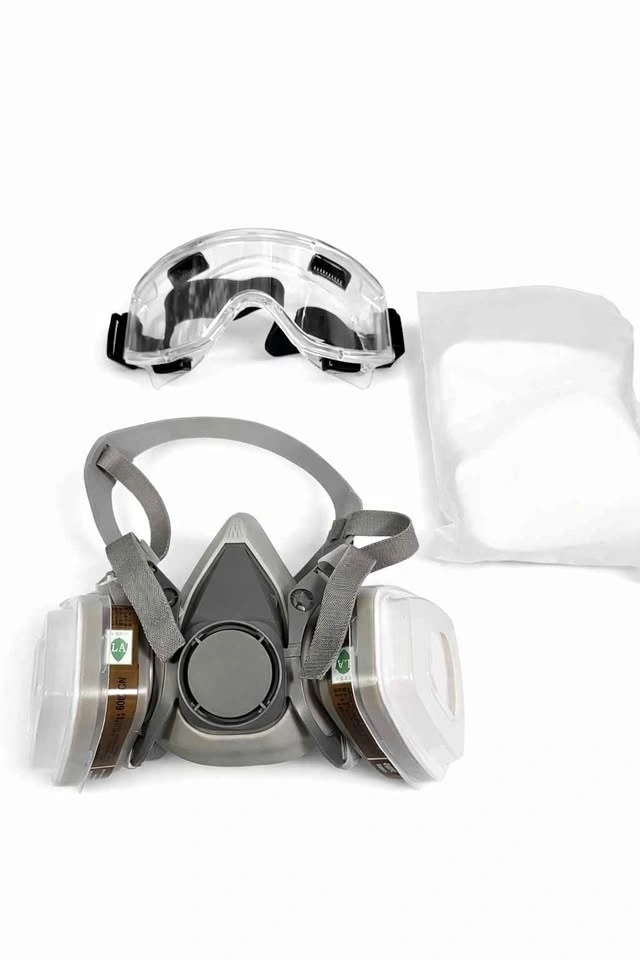 Protective respirator mask with dual filtration system and clear safety goggles. Ideal for painting, sanding, woodworking, resin work, DIY projects, or any situation where respiratory and eye protection is needed.