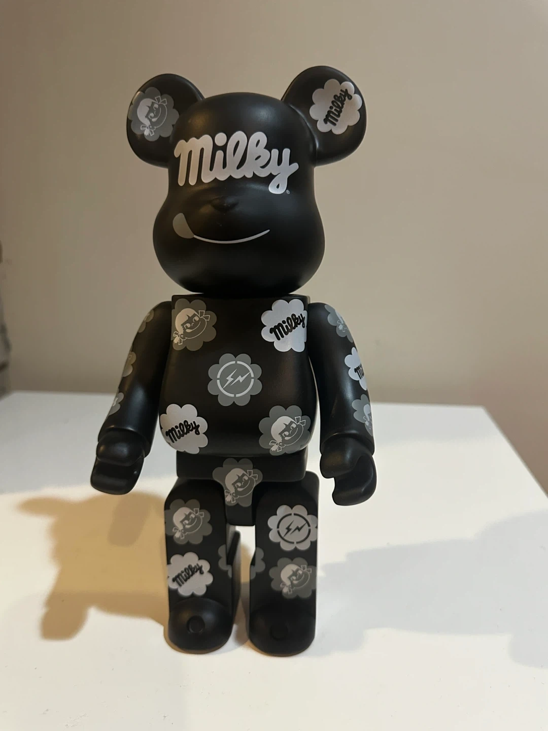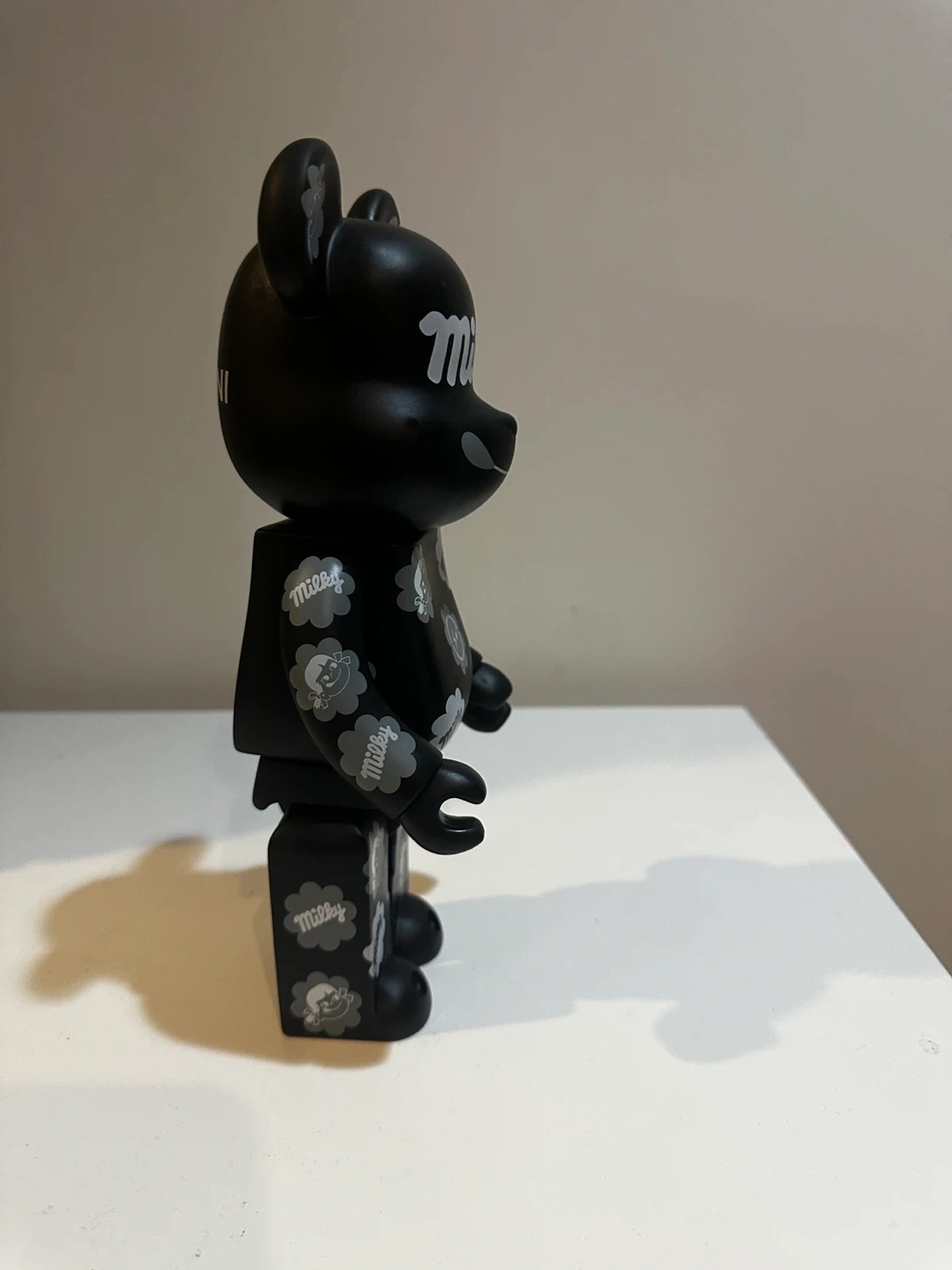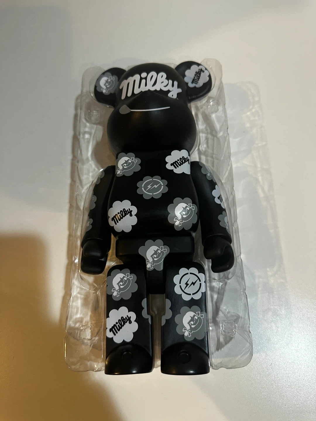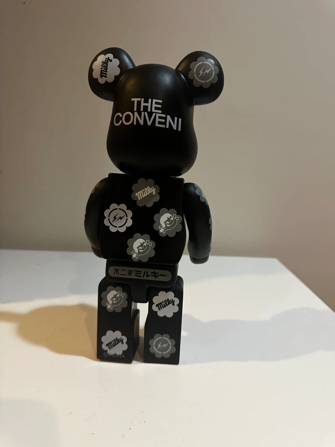 This is a black Be@rbrick toy with "THE CONVENI" text on the head and "Milky" branding. It features a repeating pattern of cloud and lightning bolt graphics. Comes in original packaging.