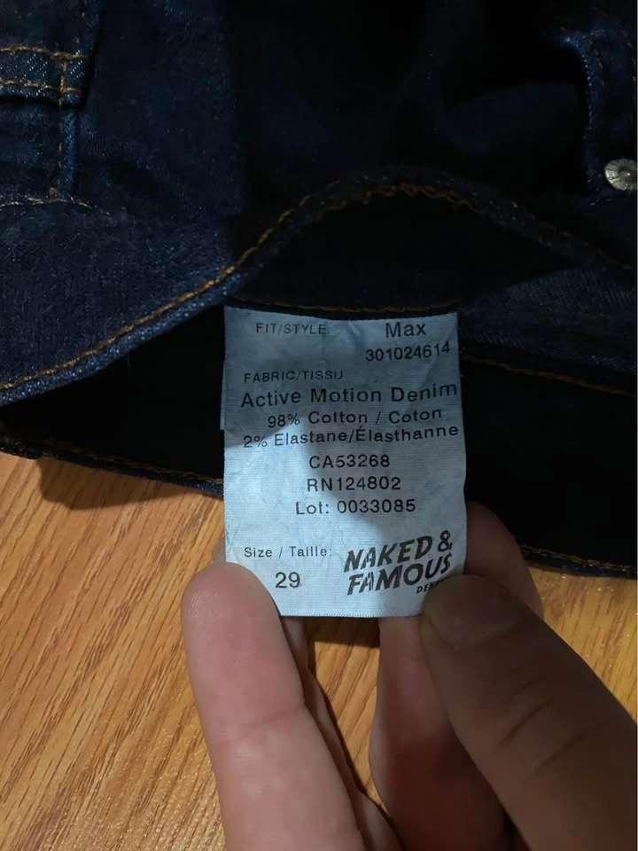 Stretchy, comfortable Active Denim line from Naked & Famous. Slim, clean look with lots of mobility. Great condition, no major flaws — perfect everyday jeans with premium quality. Pickup: Tim Hortons — 18682 Fraser Hwy, Surrey (V3S 7Y4). Check my profile for bundle deals.