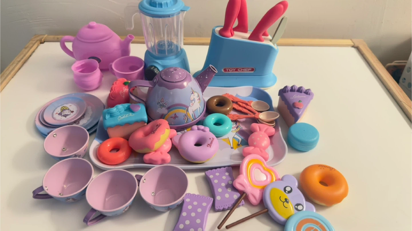 This fun set includes a purple teapot, blender, and knife block with utensils. You'll also find play food like donuts, cake slices, and lollipops. Great for imaginative play!