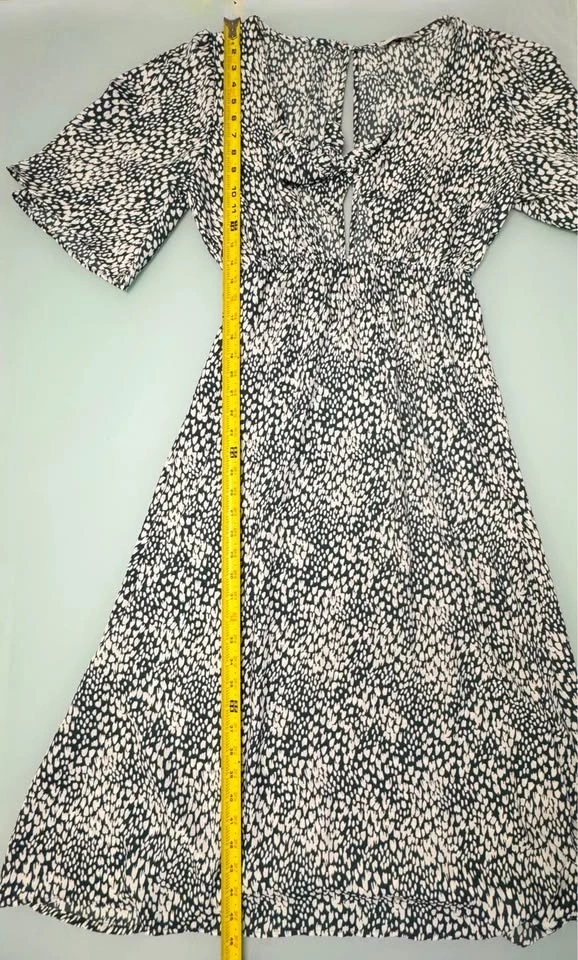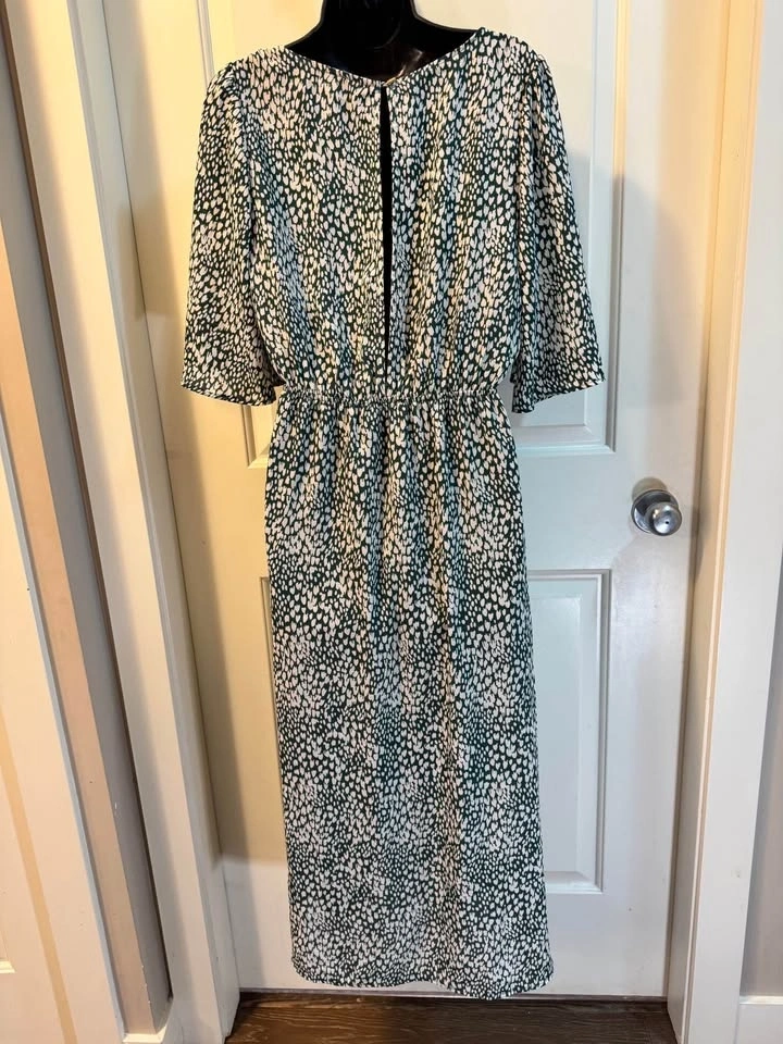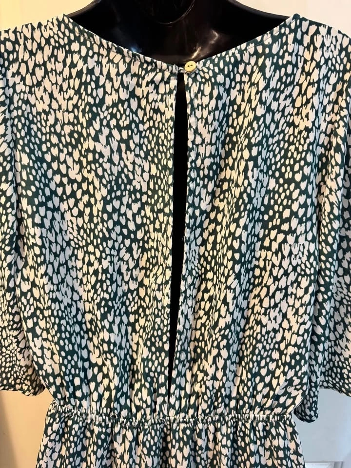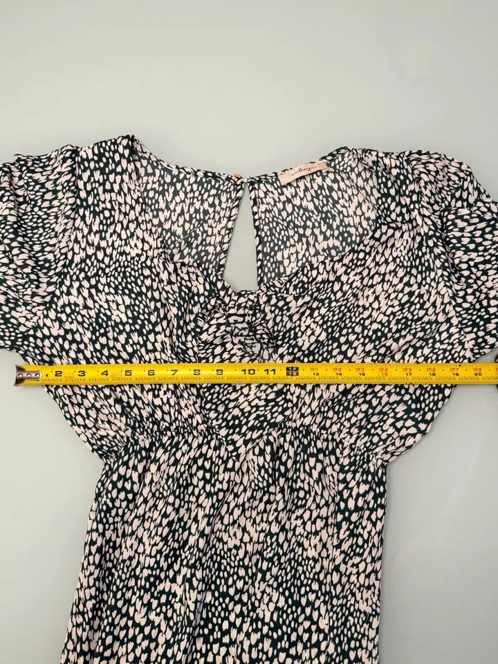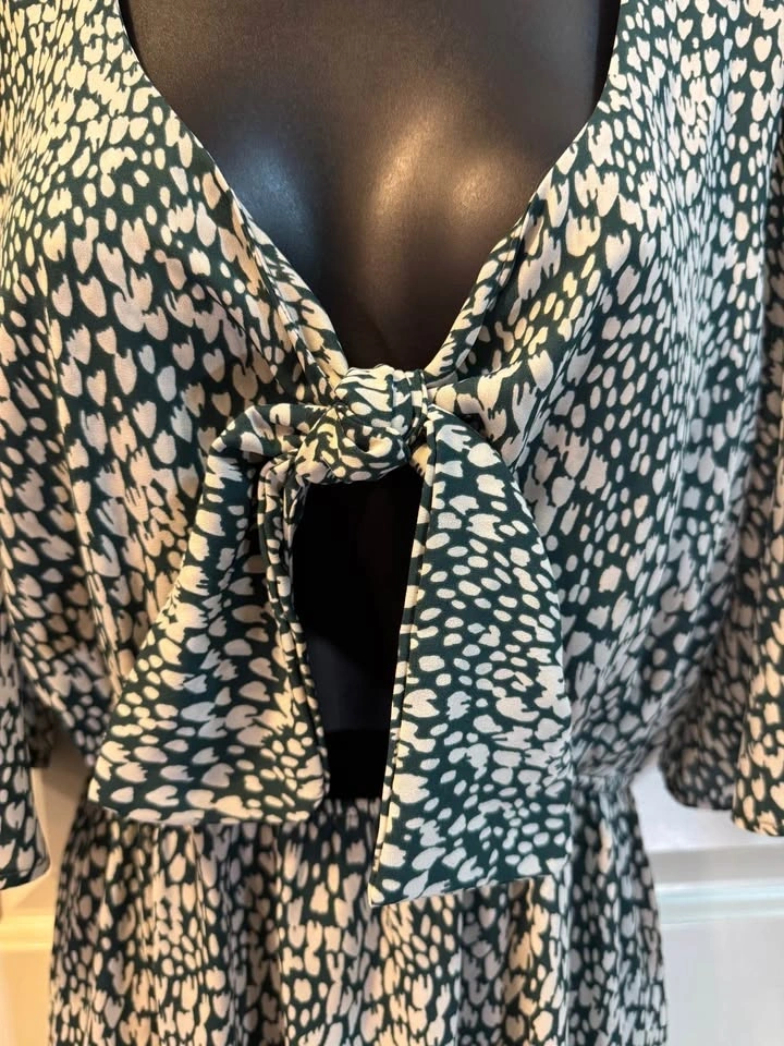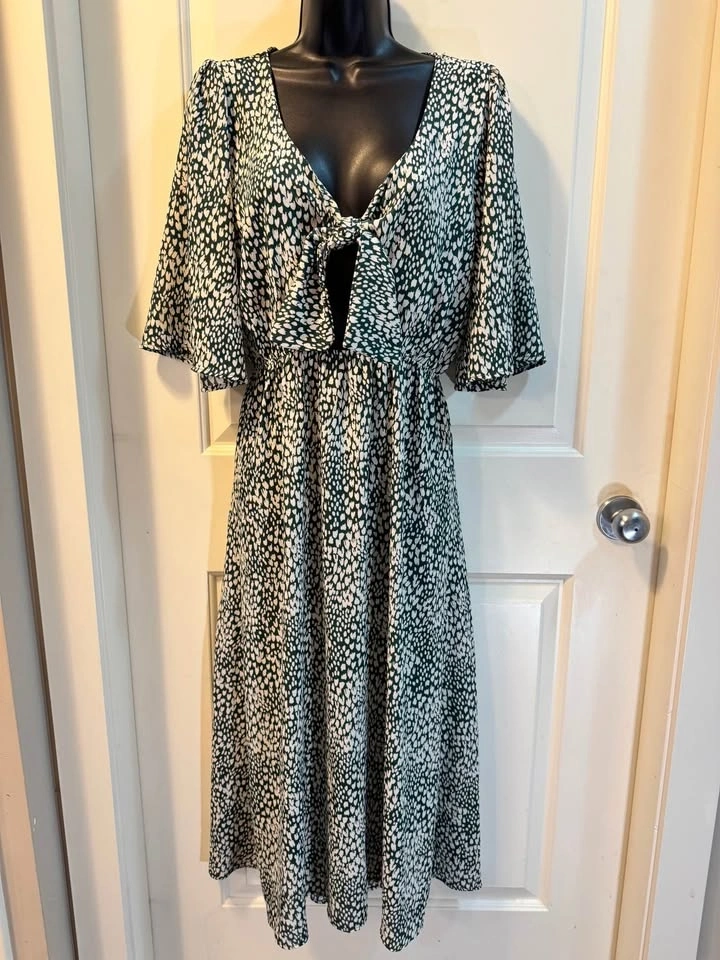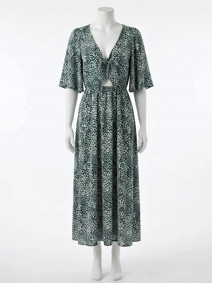 Make a statement in this lightweight chic Audrey 3+1 maxi dress. Featuring a unique green and white abstract heart/micro-animal print, this dress combines a playful pattern with a sophisticated silhouette. The front features a trendy tie-knot detail with an eye-catching keyhole cutout, while the back offers a deep V-opening with a single button closure.
