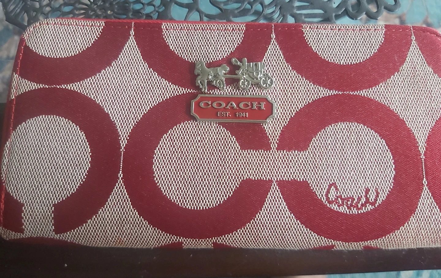 This is a Coach zip-around wallet featuring the signature 'C' pattern in red and beige. It has a metal logo accent and a zip closure to keep your essentials secure. This wallet is made with durable canvas material.