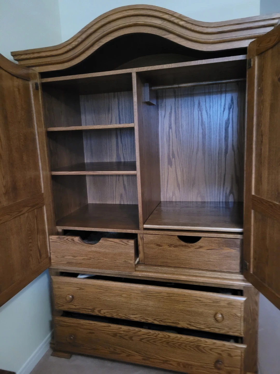 This solid wood armoire offers ample storage with its hanging rod, shelves, and three drawers. It's crafted from warm-toned wood with classic detailing. Perfect for organizing clothing and accessories!