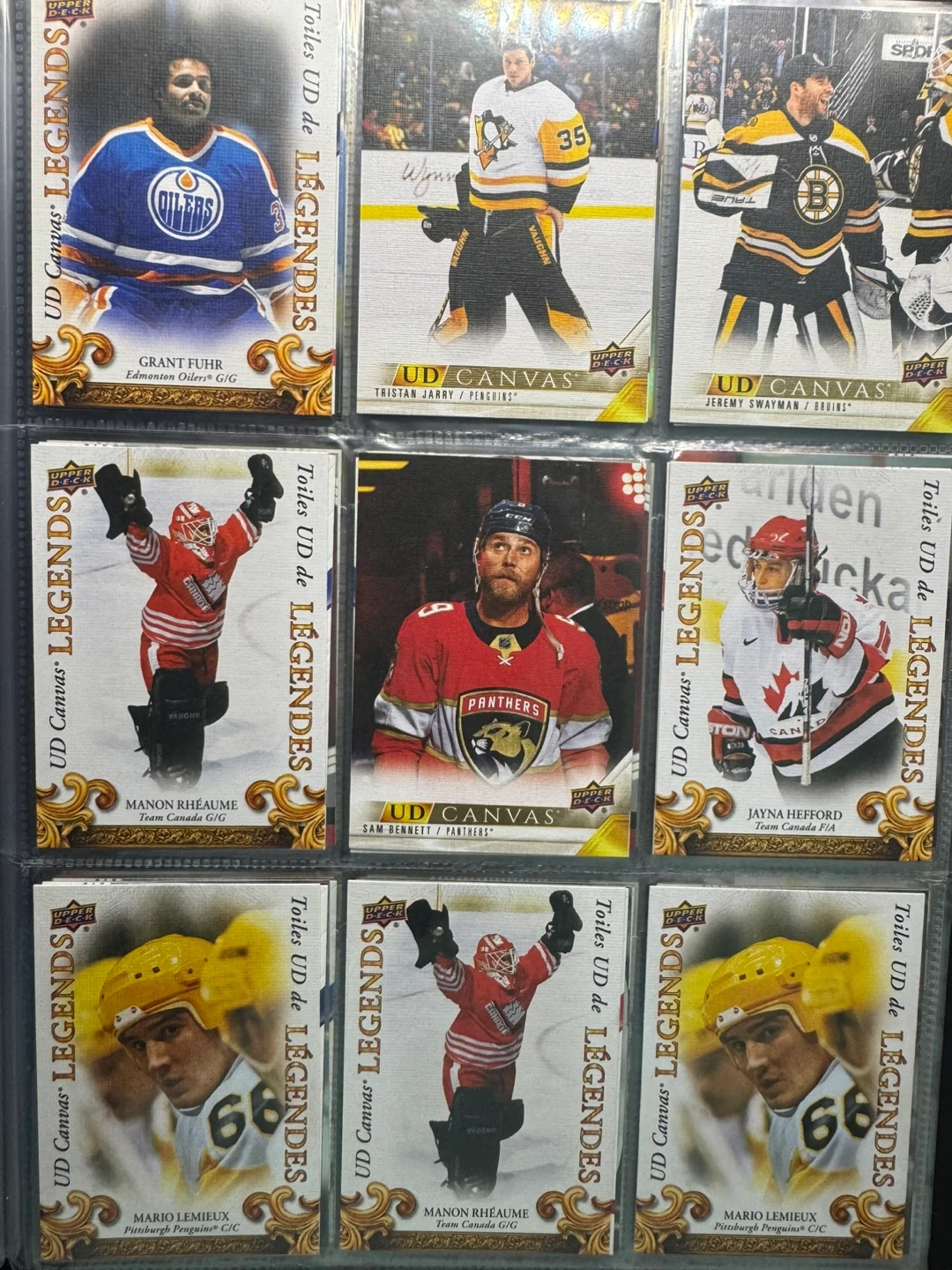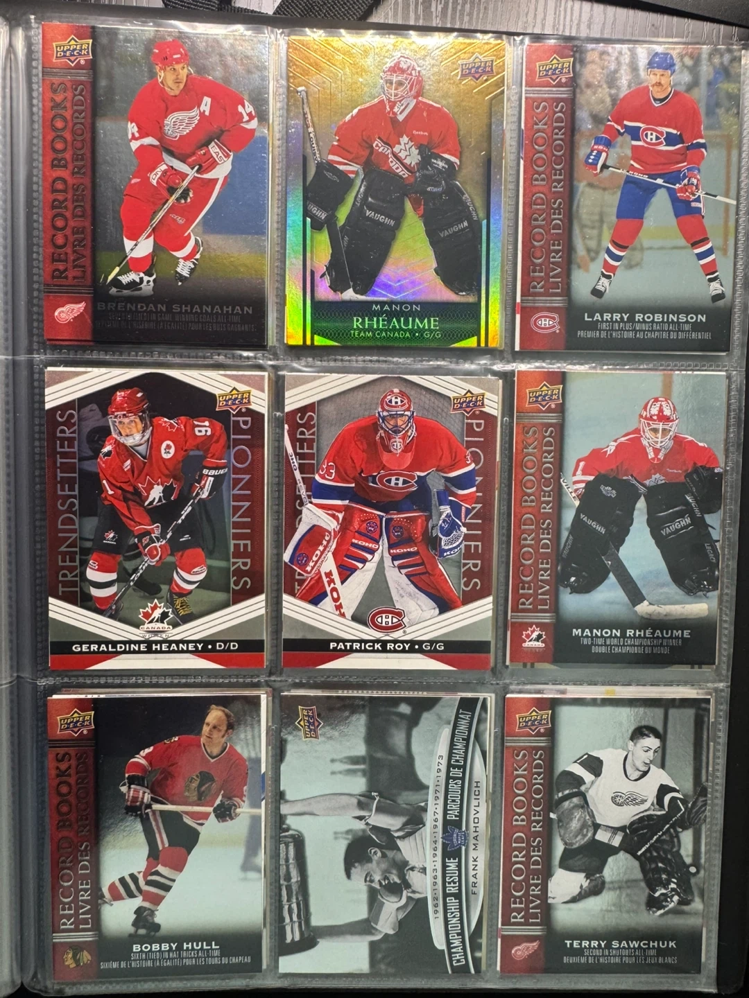 This is a collection of Upper Deck hockey cards featuring various NHL players. The cards showcase players from different teams and eras. They're in a binder for display. Whole binder included
