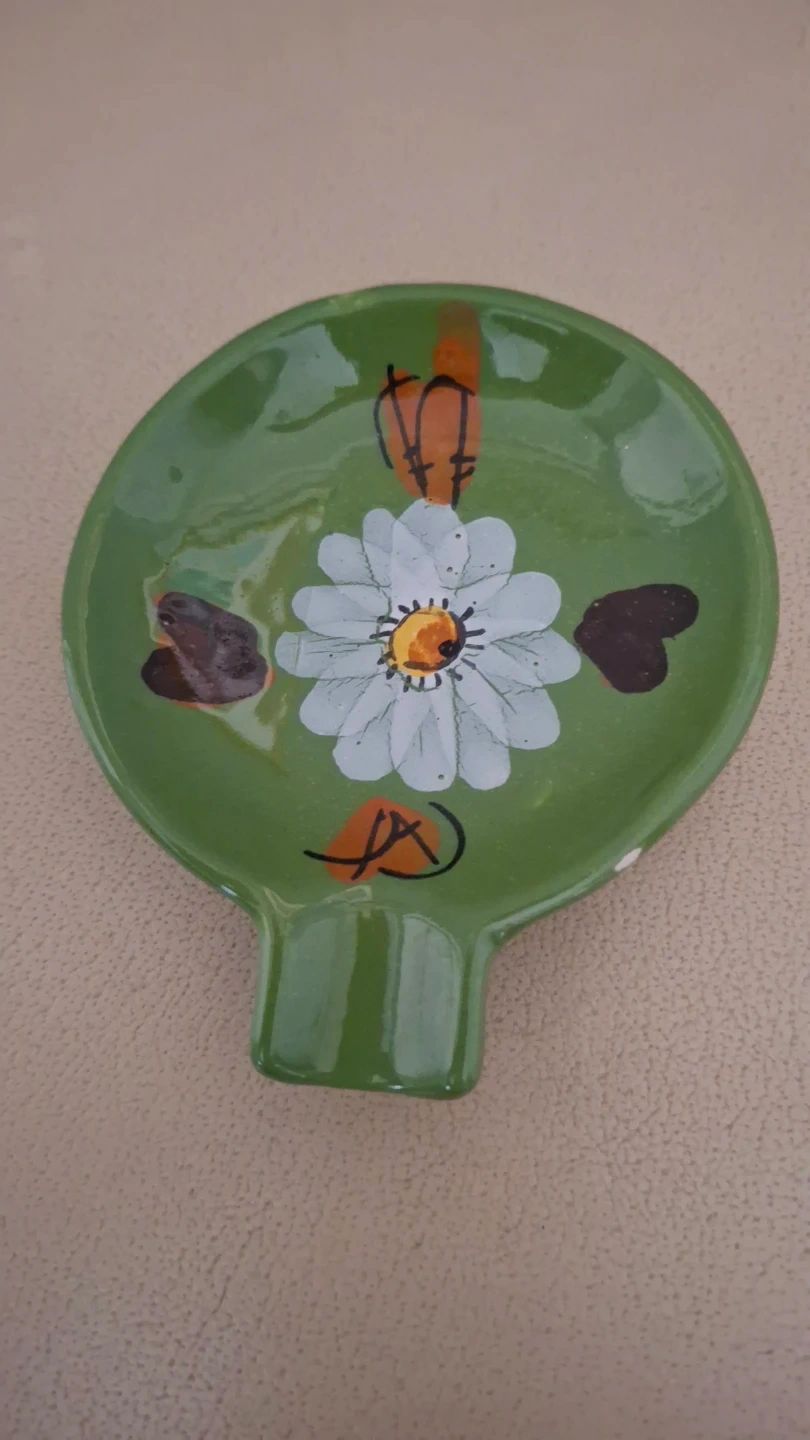 Ceramic spoon rest with a hand-painted daisy and heart design. It's green and perfect for keeping your countertops clean while cooking. Adds a nice touch to your kitchen!