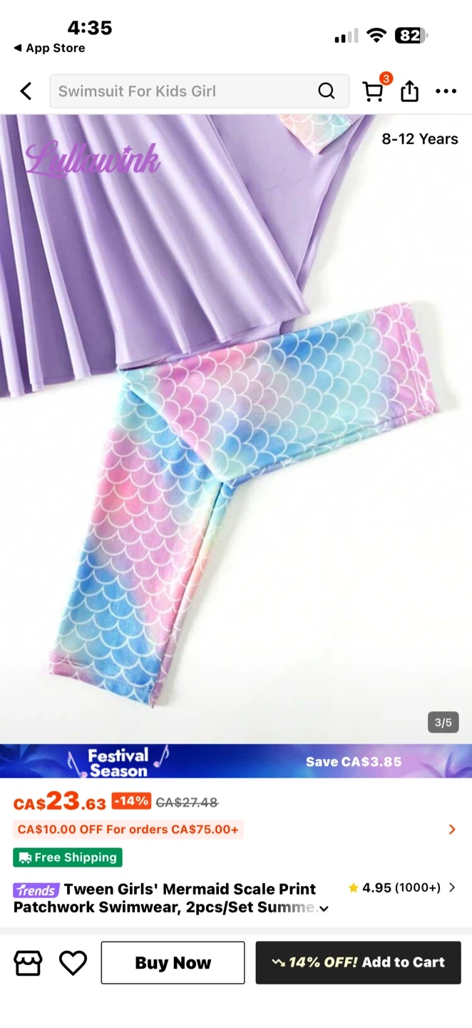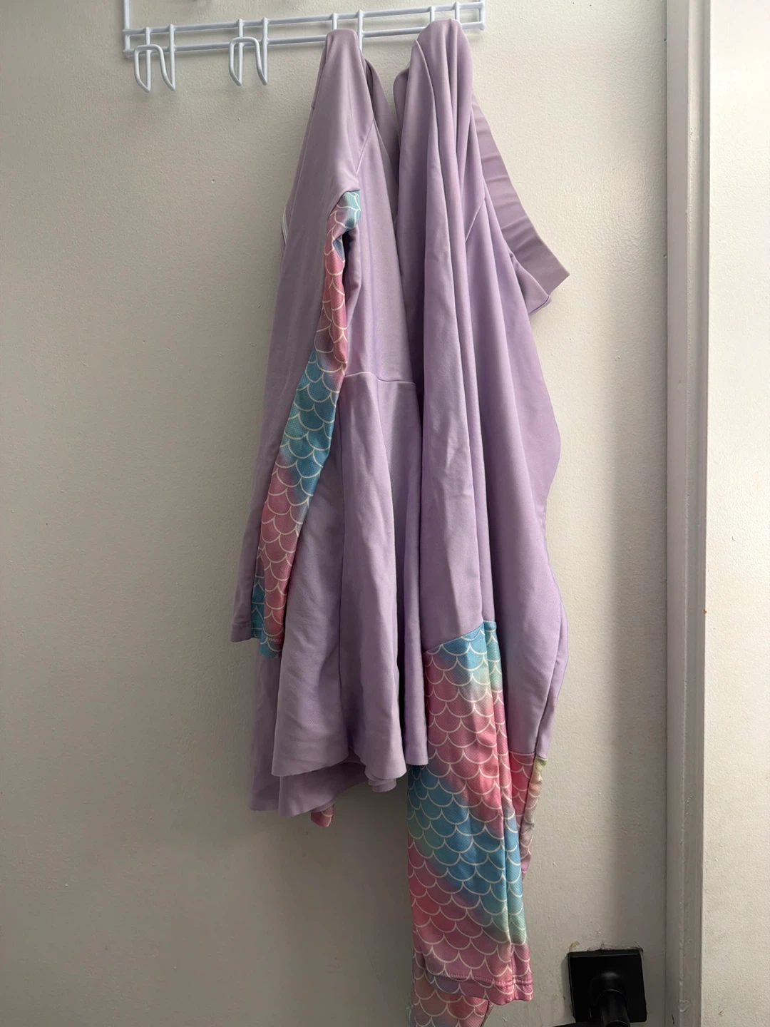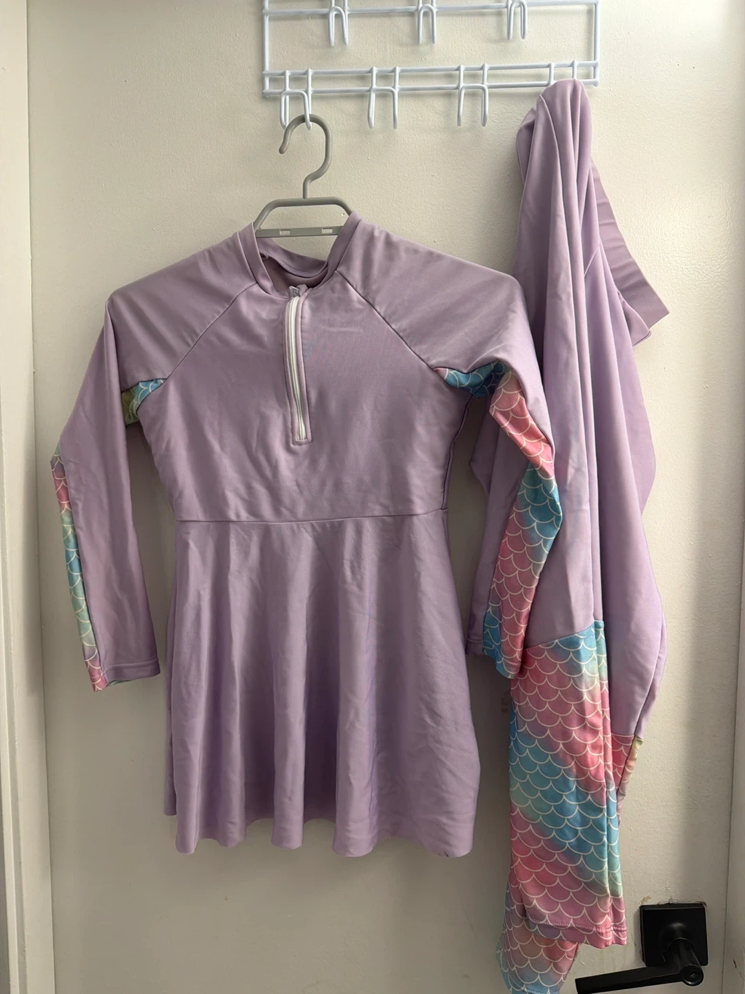 A lilac long-sleeved swimsuit with rainbow mermaid scale accents on the sleeves and matching bottoms. This set is designed for kids aged 8-12 years. Perfect for swimming and beach days!