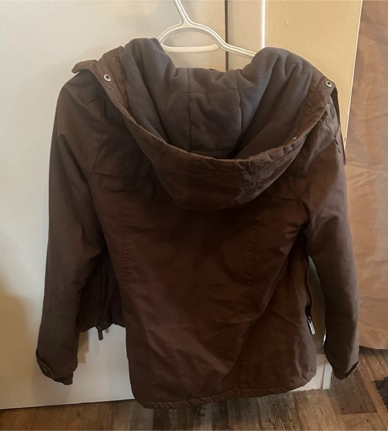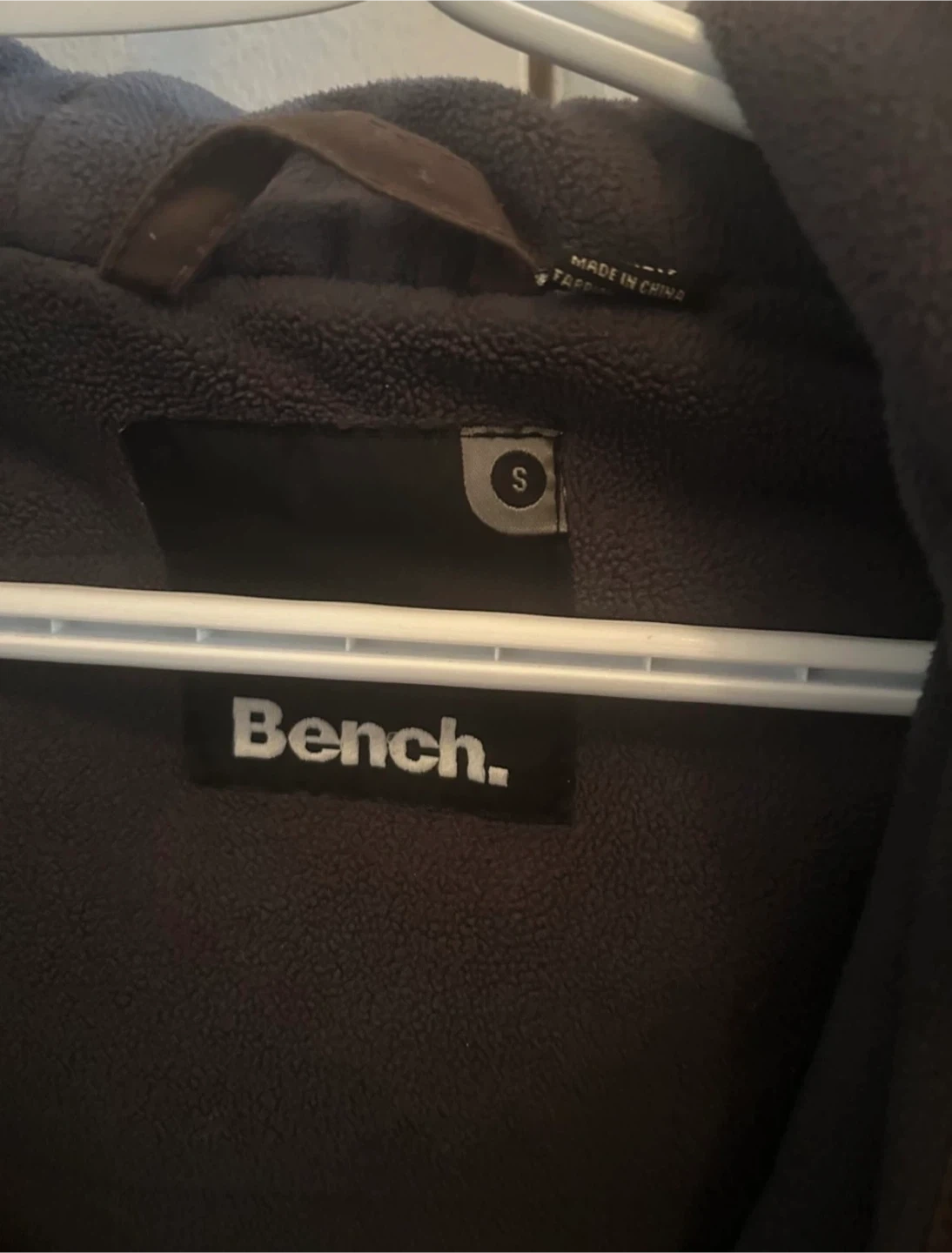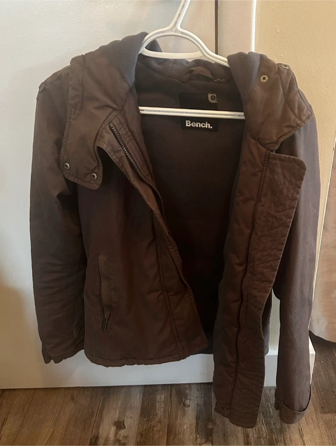 Bench. brown hooded jacket lightly worn with a fleece lining. It's a size small. Offers warmth and a stylish look for cooler weather.