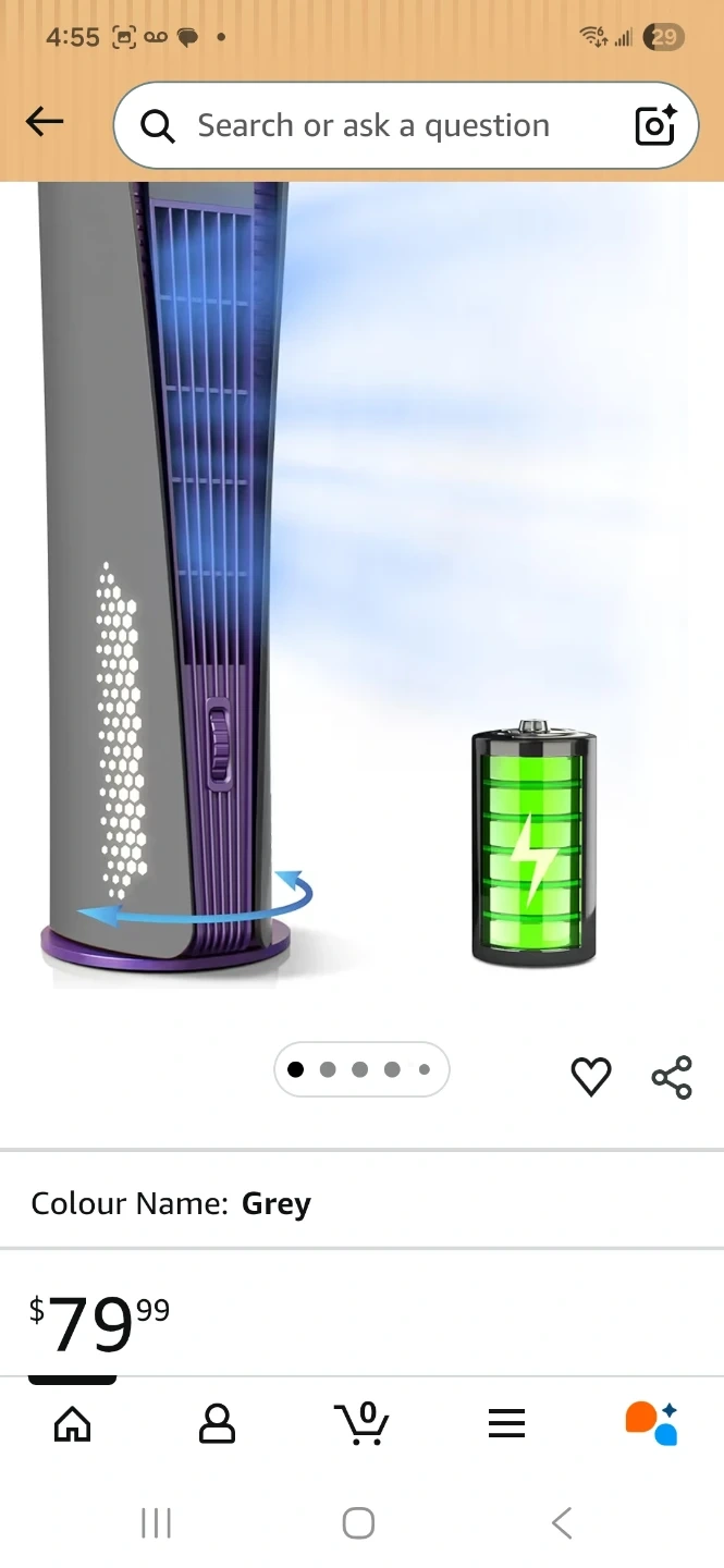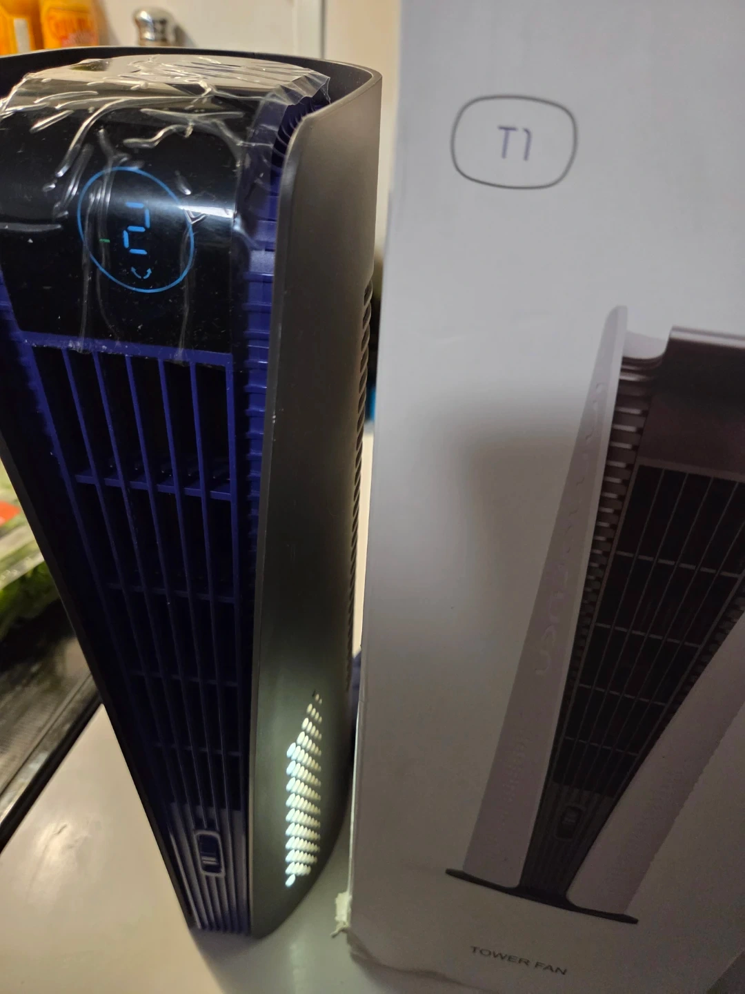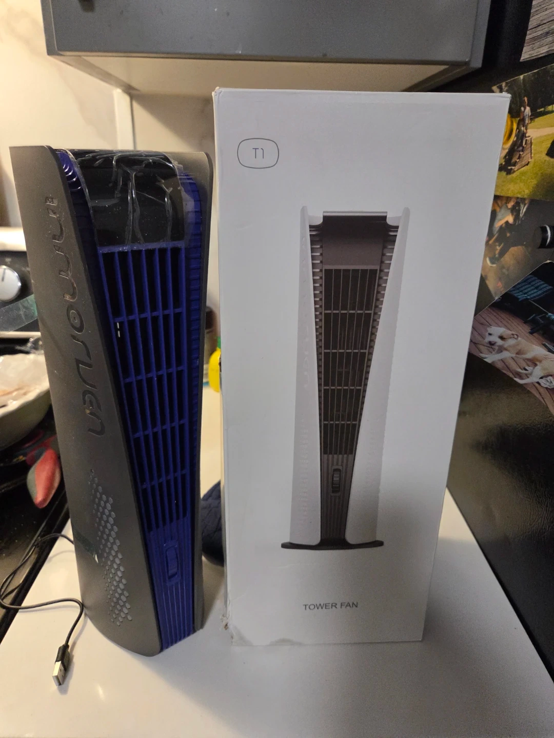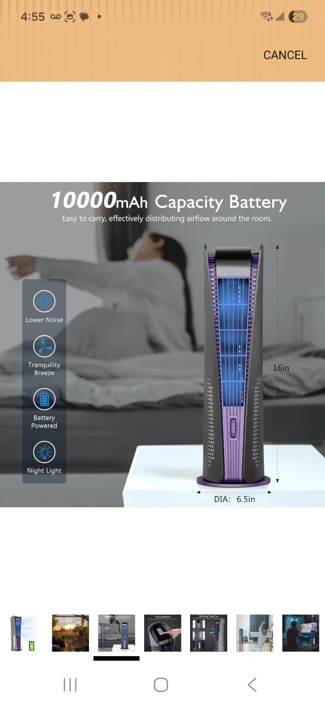 Inmorun tower fan with a 10000mAh battery capacity. It's 16 inches tall with a 6.5-inch diameter. This fan offers lower noise, tranquility breeze, and a night light. Includes original box.