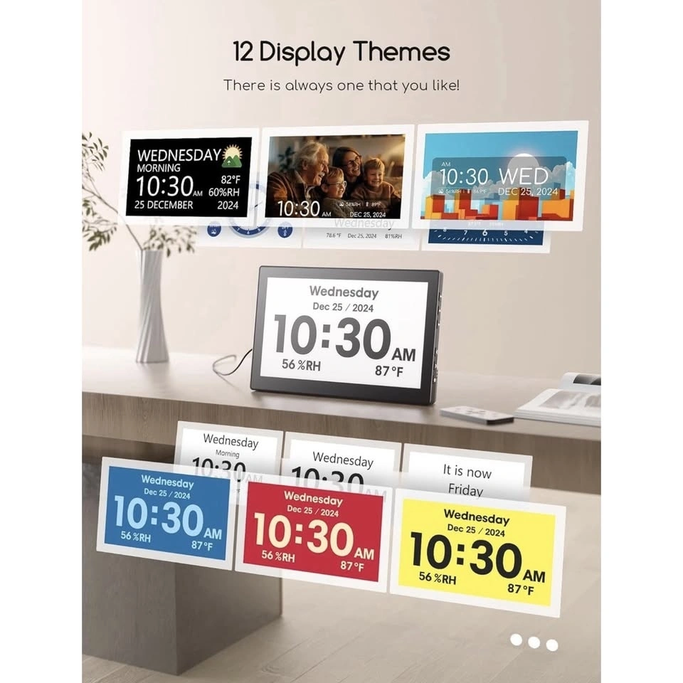 Condition: very light invisible scratches on screen, in excellent condition overall. Raynic 10.1” Digital Calendar Clock – Dementia & Alzheimer Clock for Seniors with Date and Time. 20 Alarms & 20 Reminders, 12 Themes, 6 Language, Auto Dimming, Indoor Temp for Bedroom, Wall, Gift.