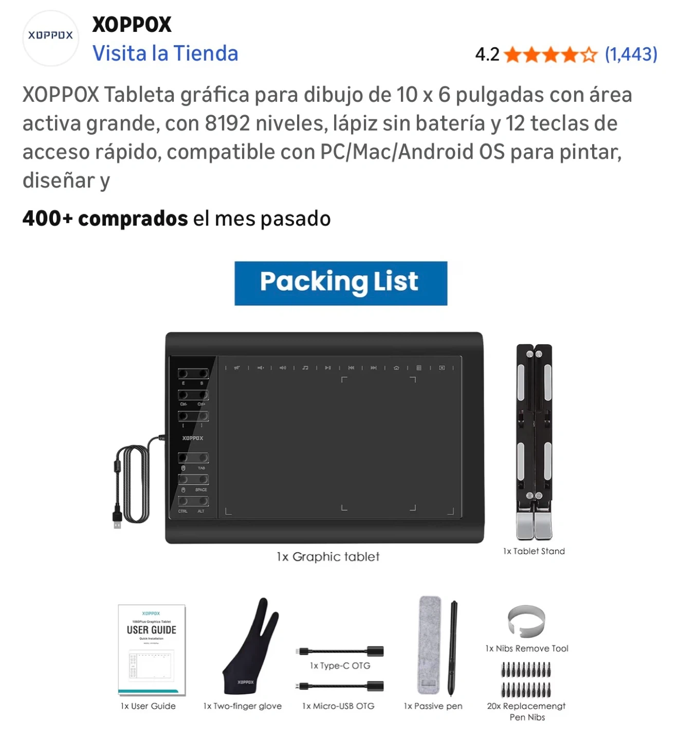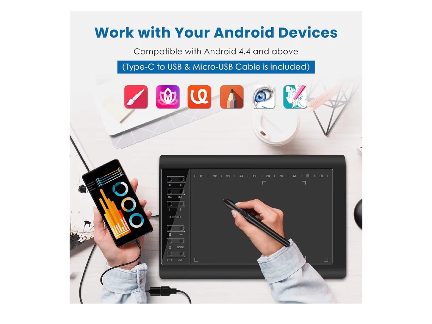 This Xoppox battery-free pen tablet has a 10 x 6 inch active area with 8192 levels of pressure sensitivity. It's compatible with Windows XP/7/8/10/11, Mac OS 10.7.0 and above, and Android 4.4+. It comes with a pen, stand, cables, and replacement nibs.