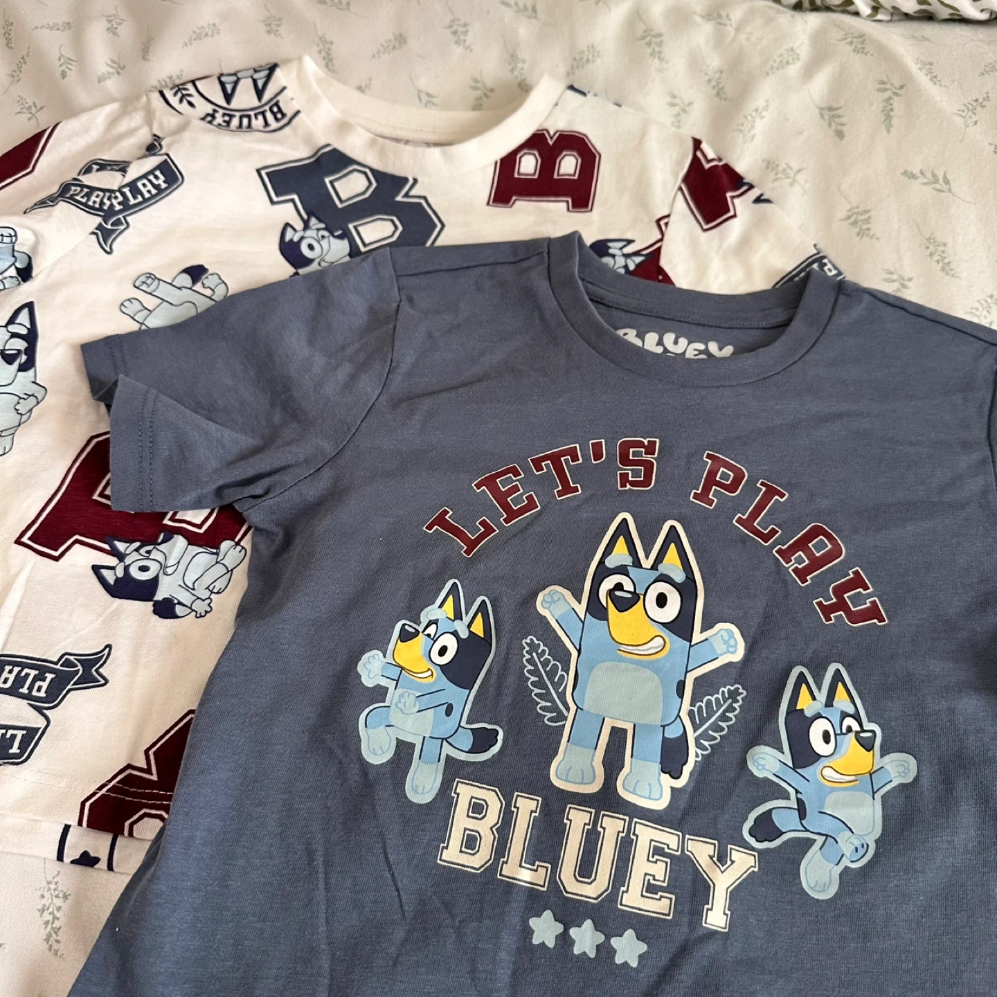 Two Bluey t-shirts for kids. Both are size 4T. The blue shirt has "Let's Play Bluey" graphics. The white shirt has "Bluey" lettering and graphics. 100% cotton fabric. Machine wash cold with like colors.