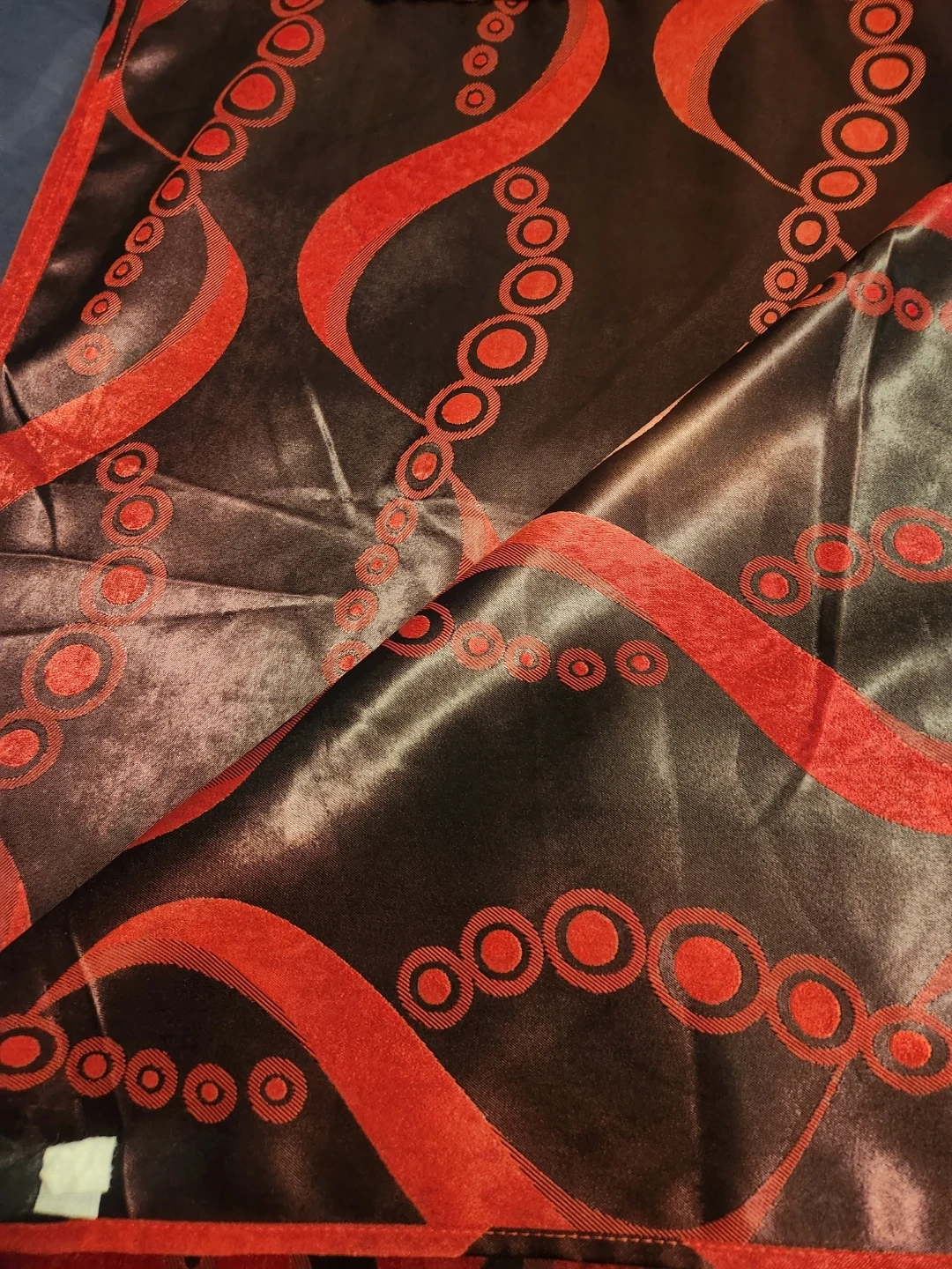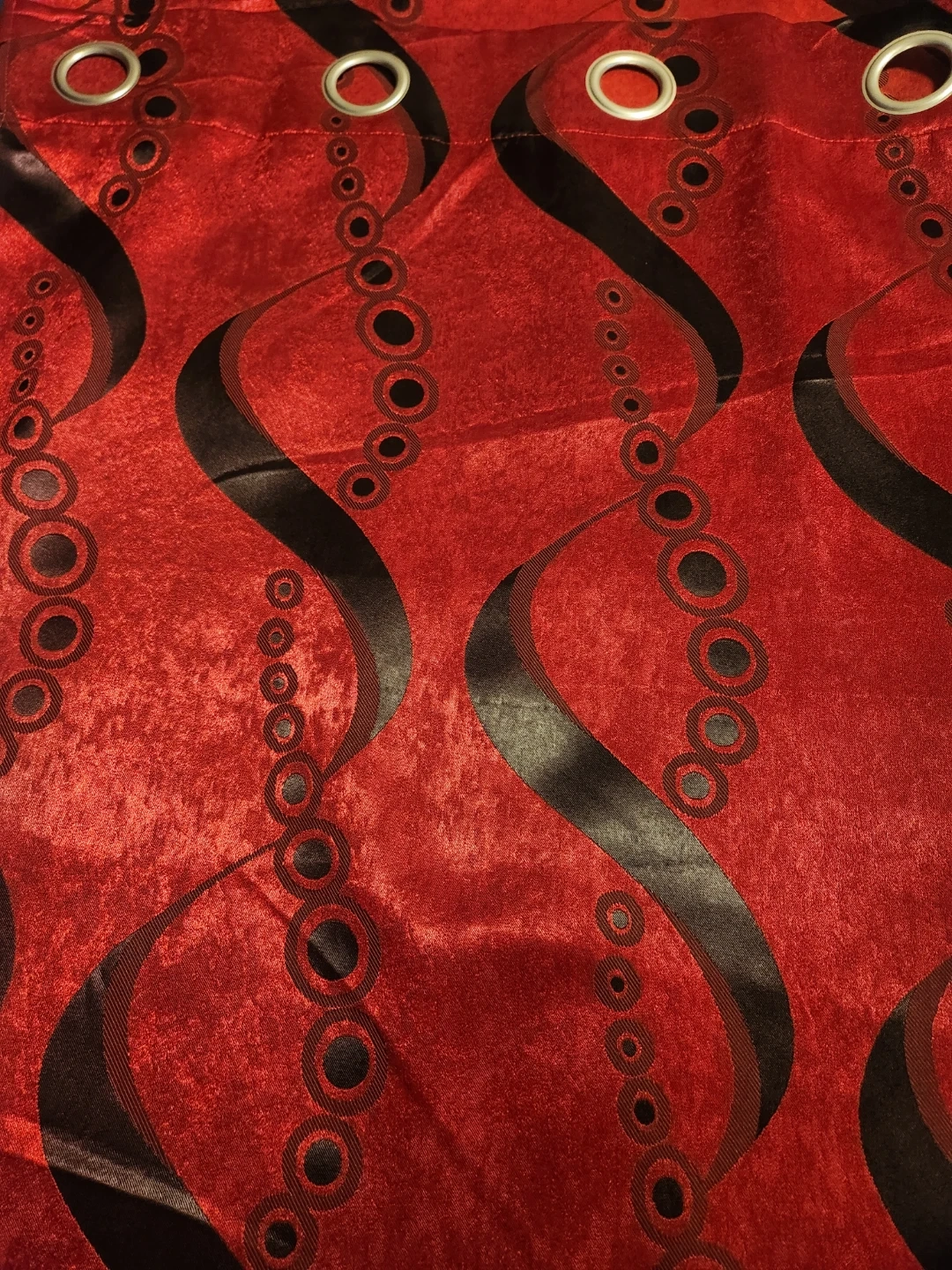 These curtains feature a bold red and black abstract design with circular motifs. They're made from a satin-like material that reflects light. The curtains come with grommets for easy hanging.