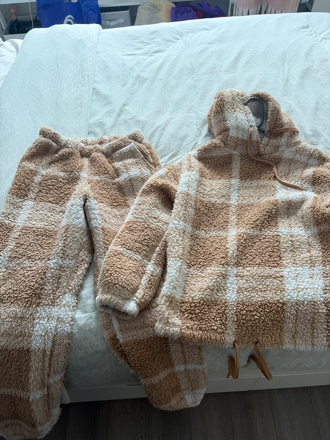 Comfy loungewear set with a brown and white plaid pattern. It's made of soft, plush material. The hoodie has a drawstring hood and the pants have an elastic waistband. It’s size small but definitely more of a medium