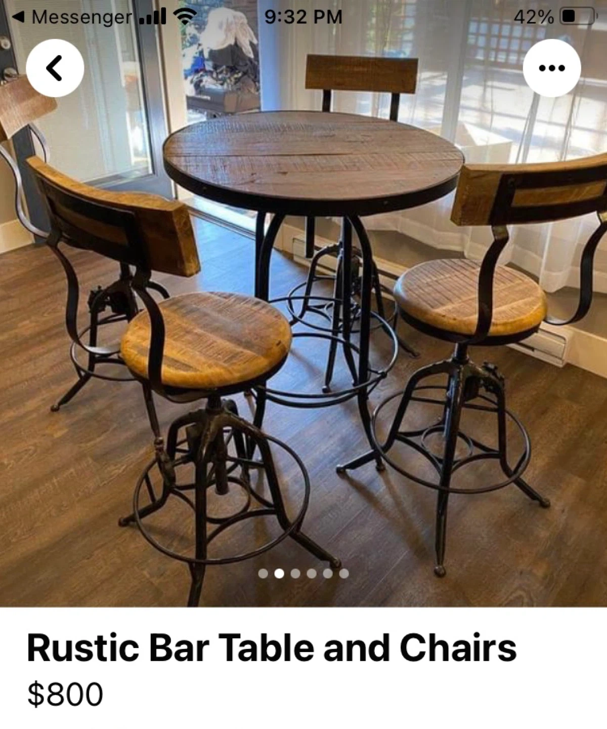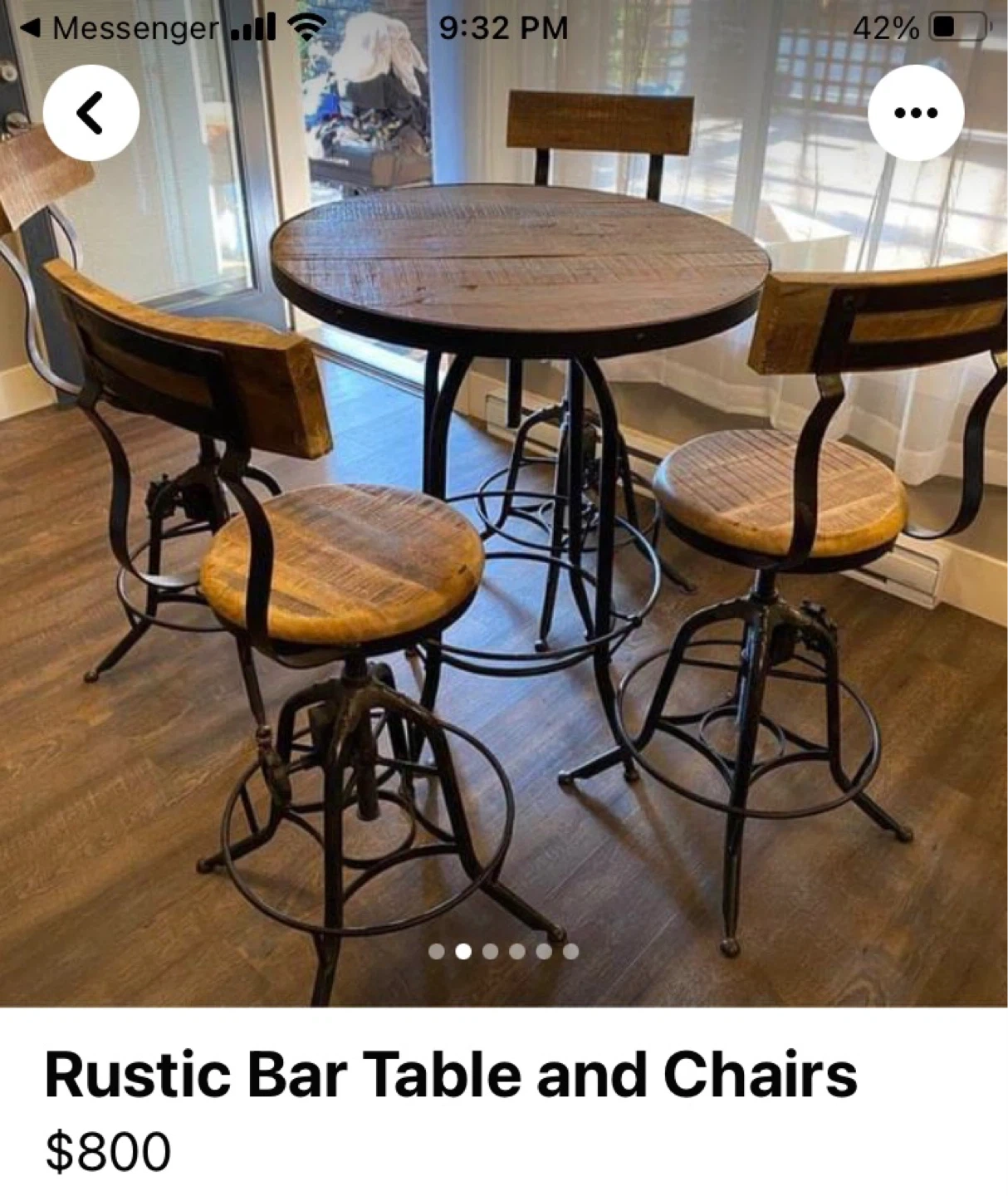 This rustic bar set includes a round wooden table and four adjustable stools with wooden seats and metal frames. It's perfect for a kitchen nook or a small dining area. The adjustable height on the stools makes them versatile!