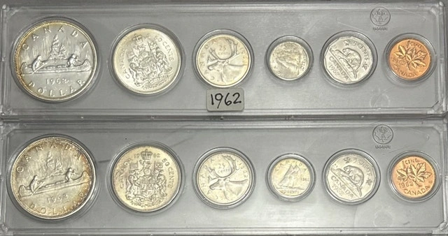 For sale are two 1962 Proof sets of Canadian silver coins, each housed in protective cases, each set contains 1.1 troy oz of silver. Selling for spot price as of 29/12/25. If the ad's up, they're available, ready to find a new home!