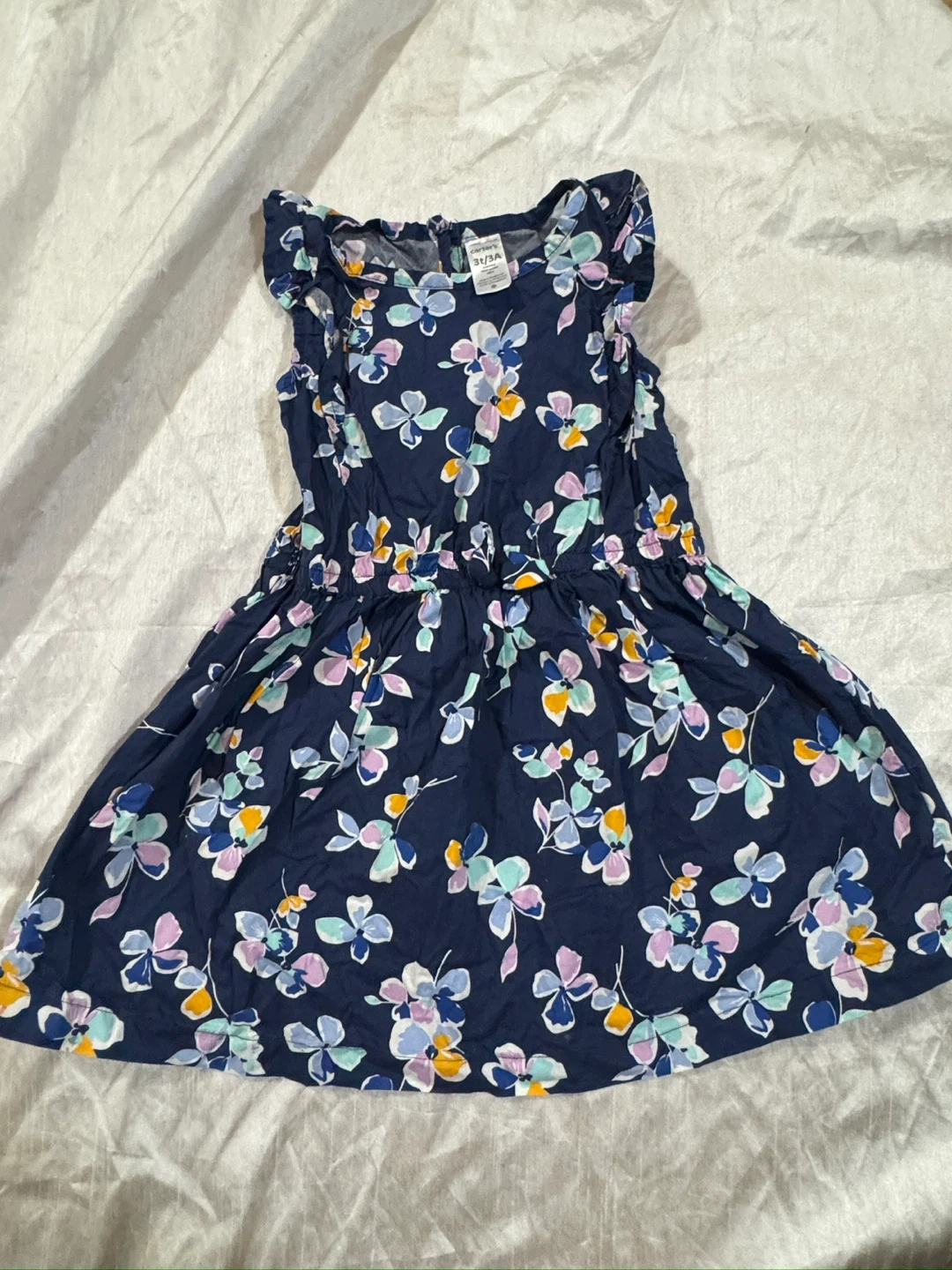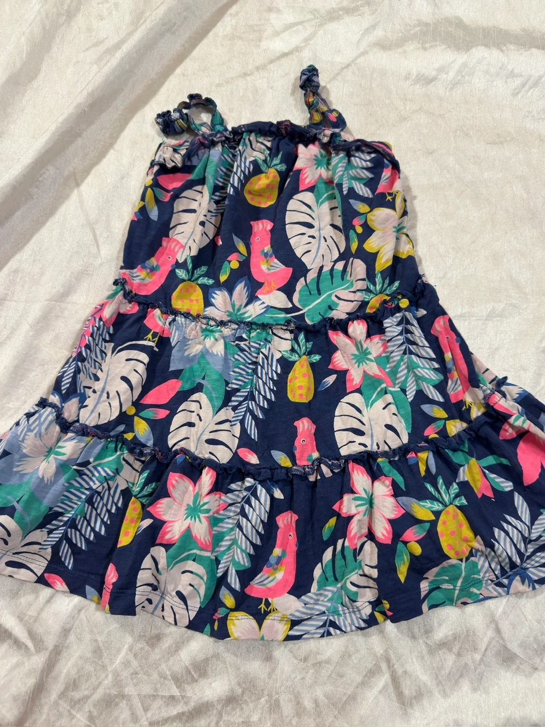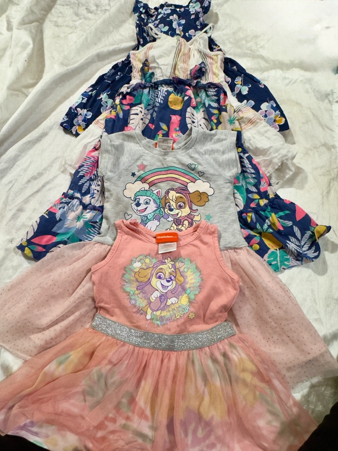 This is a bundle of three girls' dresses in size 3T. Includes a navy blue floral dress and two Paw Patrol themed dresses. One dress has a tiered skirt with tropical bird and pineapple print. The other Paw Patrol dress is pink with a tulle skirt. The remaining dress is white with colourful stripes. $5 each
