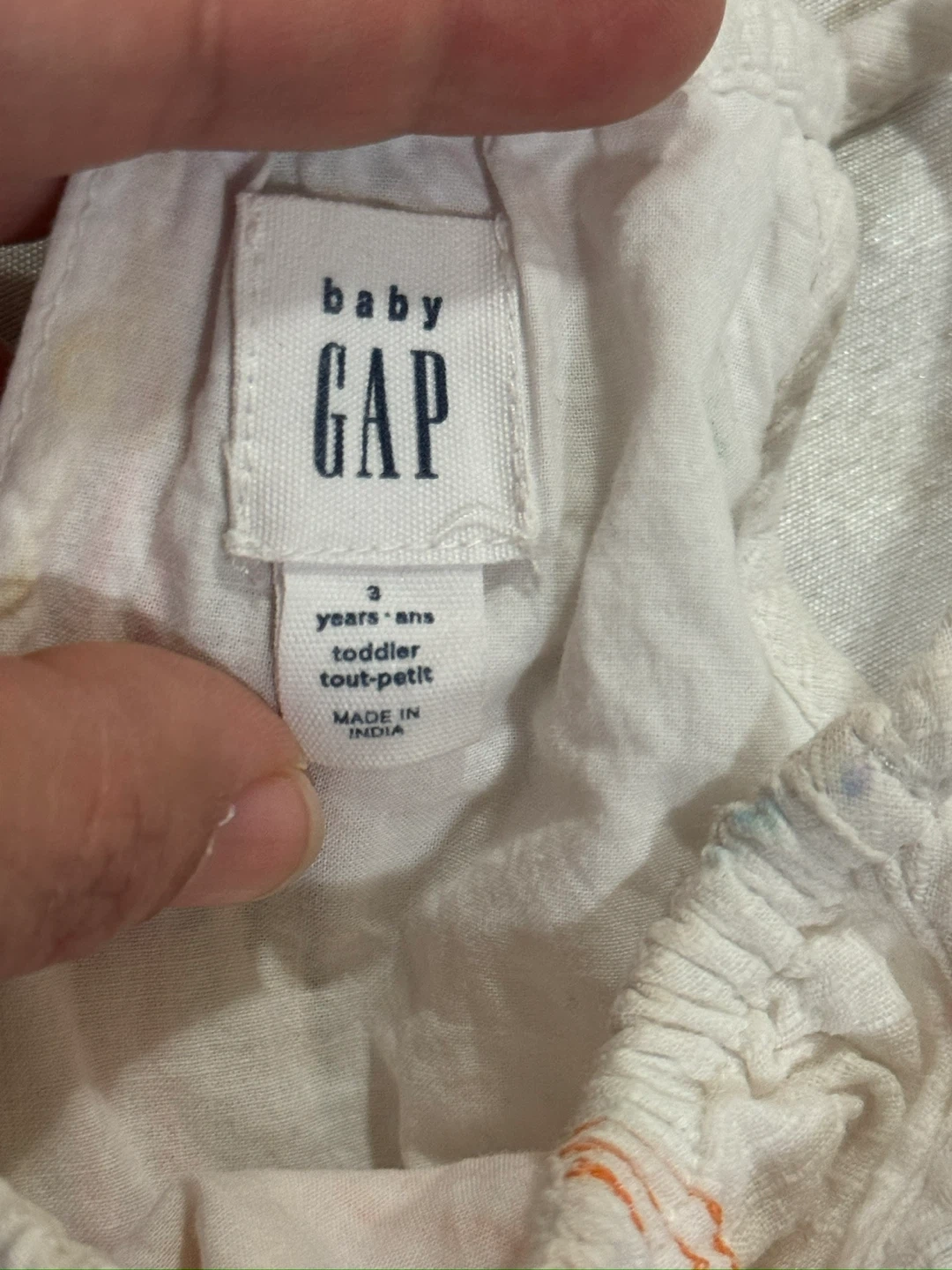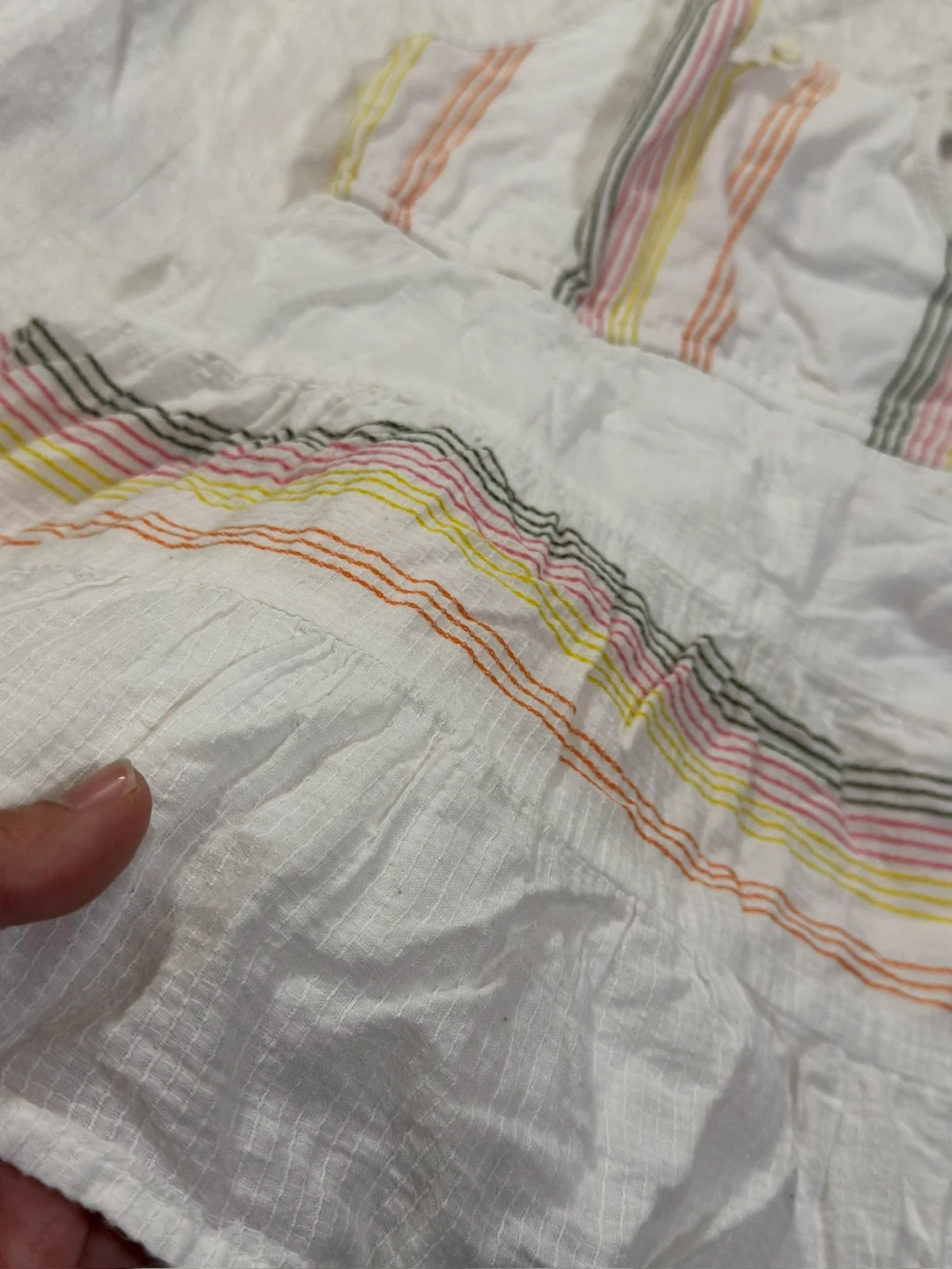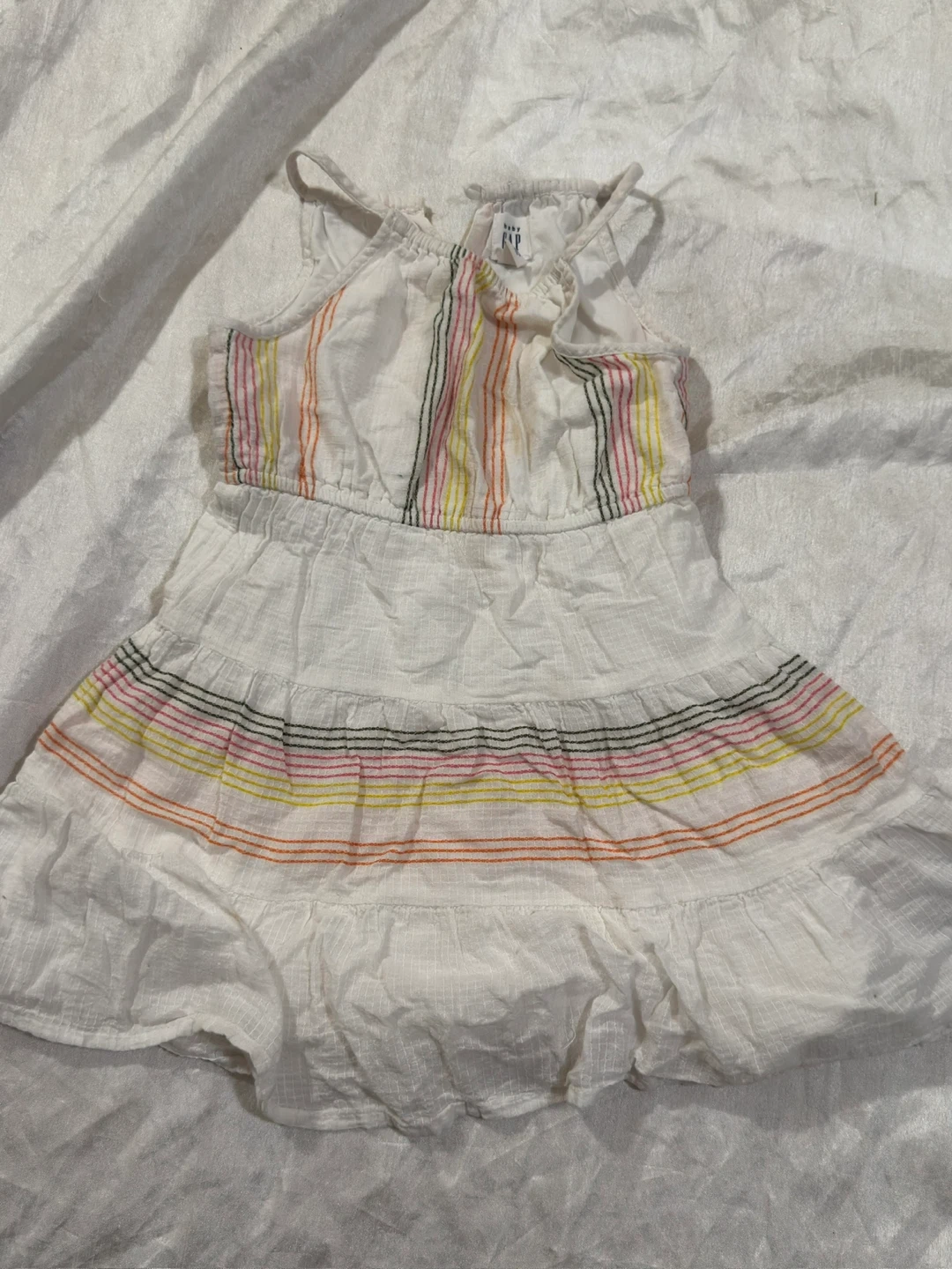 This is a bundle of three girls' dresses in size 3T. Includes a navy blue floral dress and two Paw Patrol themed dresses. One dress has a tiered skirt with tropical bird and pineapple print. The other Paw Patrol dress is pink with a tulle skirt. The remaining dress is white with colourful stripes. $5 each