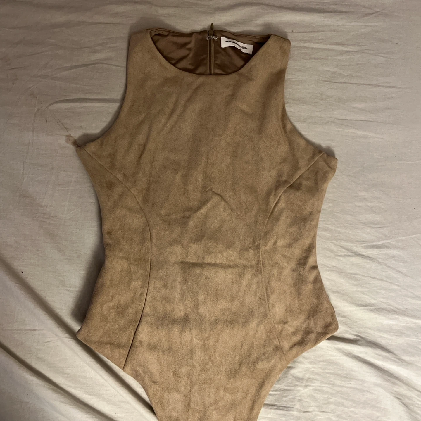 Sleeveless bodysuit from MANIERE DE VOIR in a tan suede-like material. Features a back zipper closure and snap fastenings at the crotch. Material's texture gives a luxe feel.