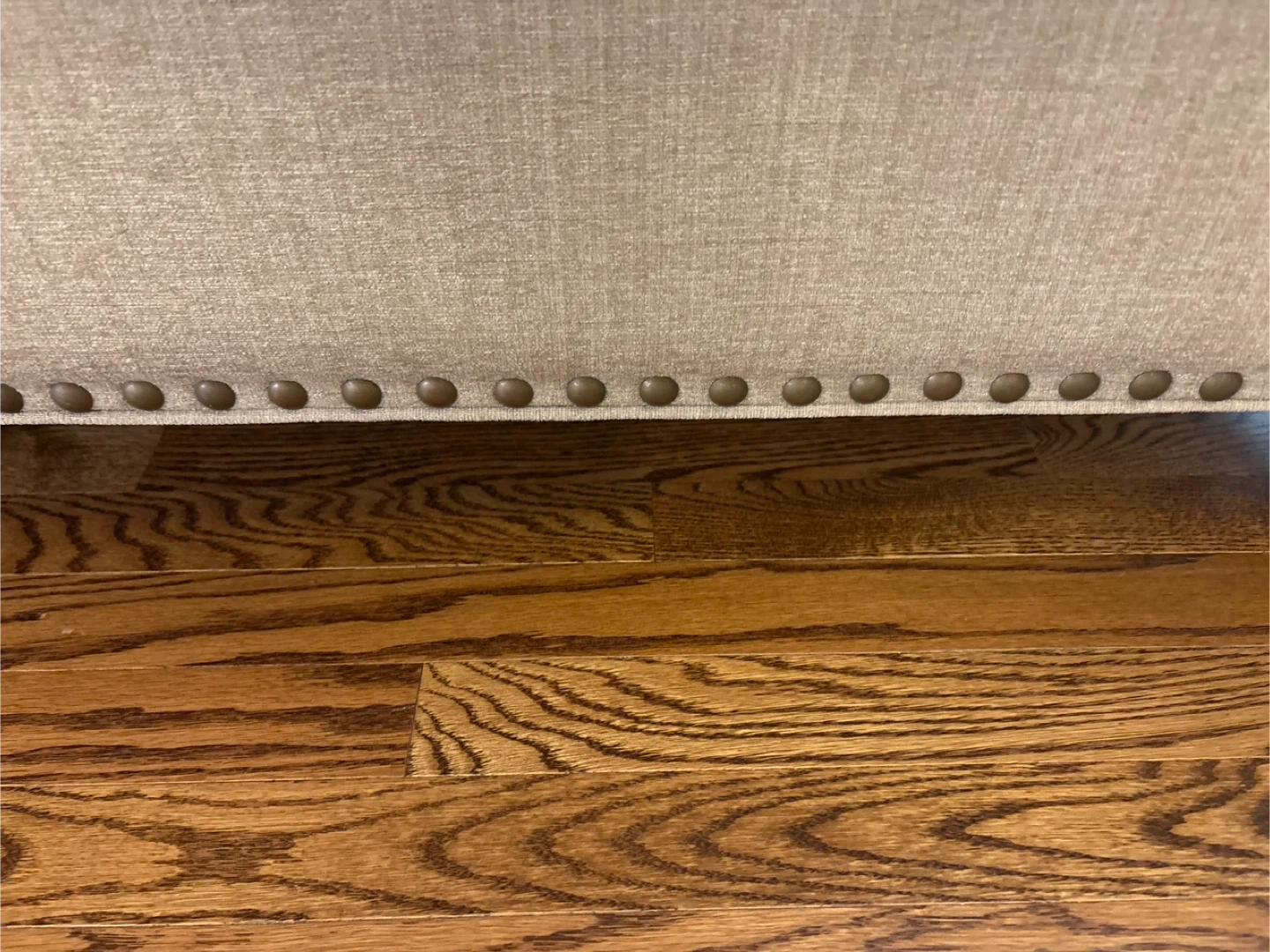 Comfortable three-seater sofa in a neutral beige fabric. It comes with four accent pillows for added comfort and style. Decorative nailhead trim lines the base.