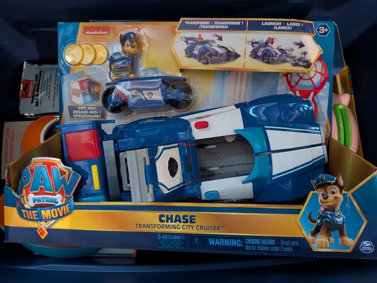 Transforming City Cruiser toy from Paw Patrol The Movie. Includes Chase figure and transforming vehicle. Requires 3x AG13 (LR44) batteries. Recommended for ages 3+.