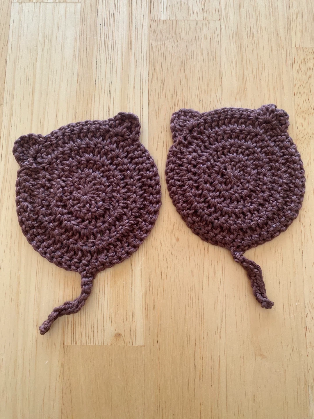 •Two adorable, handmade crochet coasters shaped like cat faces with little tails