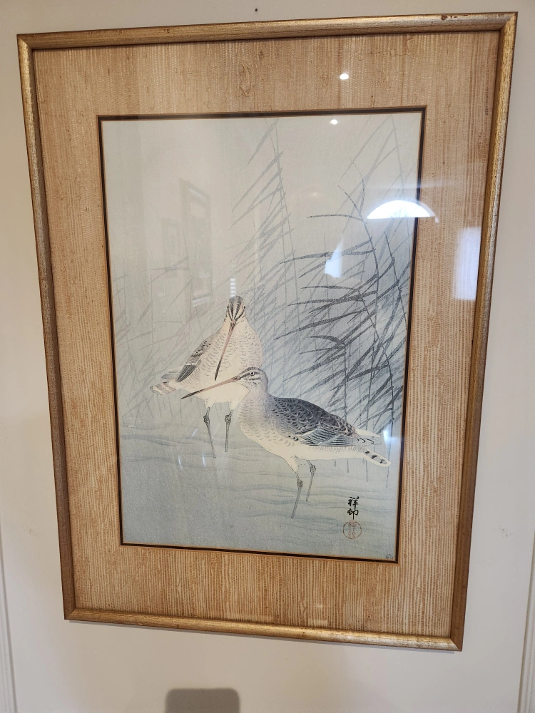 Beautiful framed print. Depicts two birds in a wetland setting. Light coloured matting. Wood frame. Asian-inspired artwork.