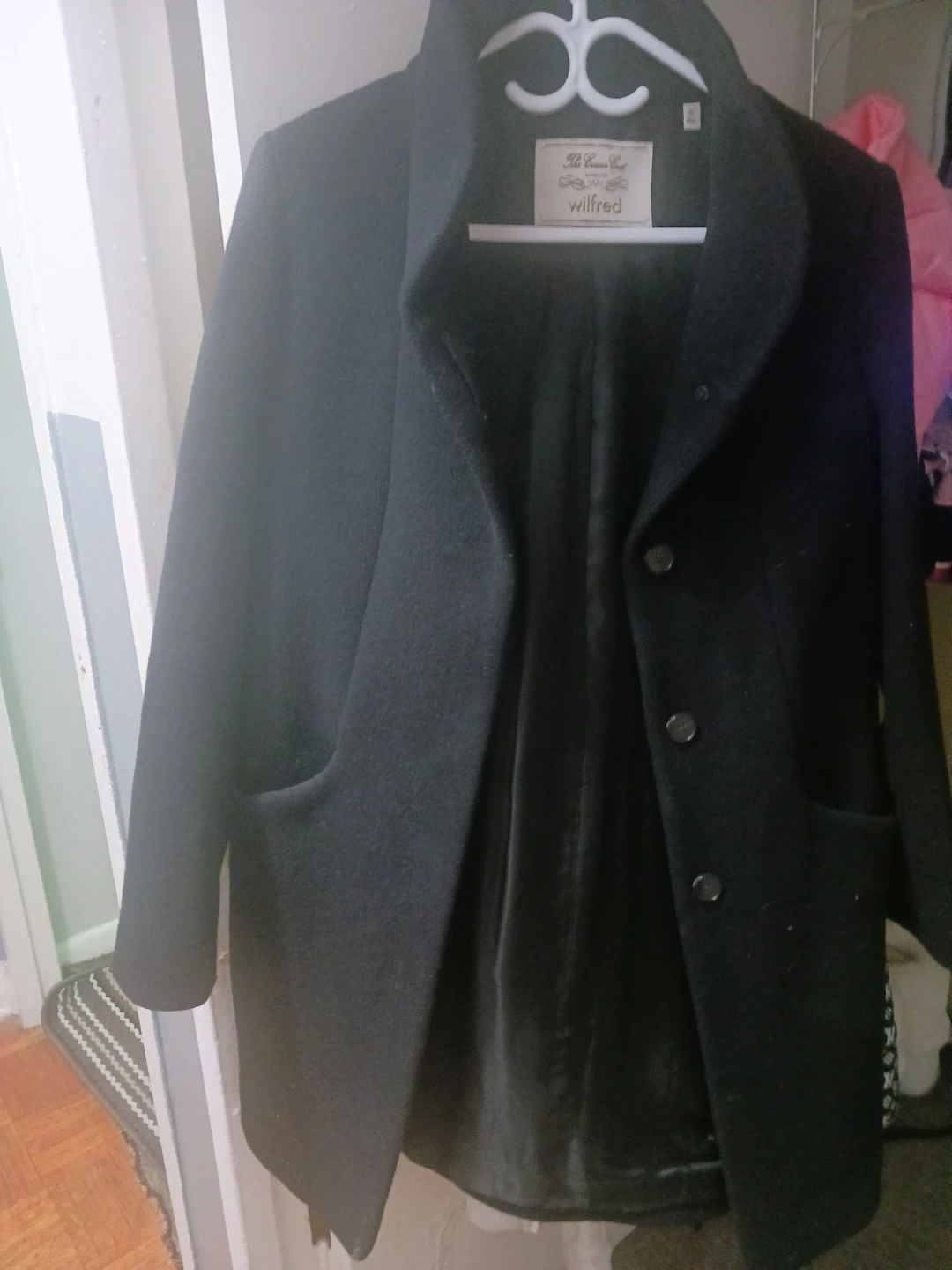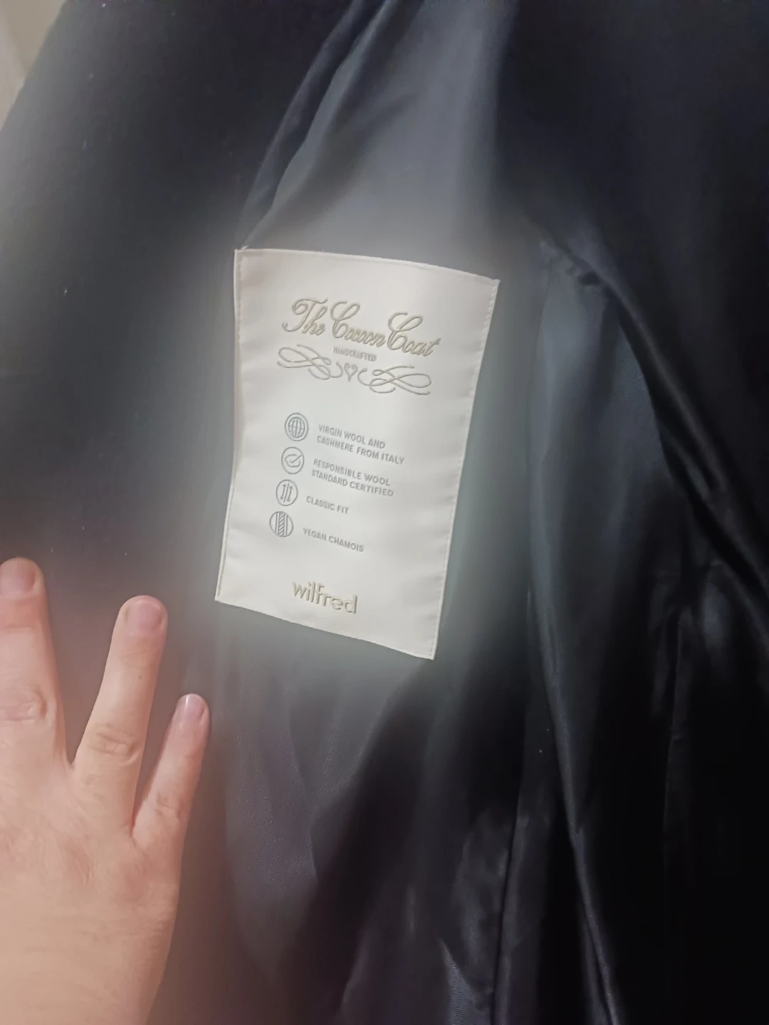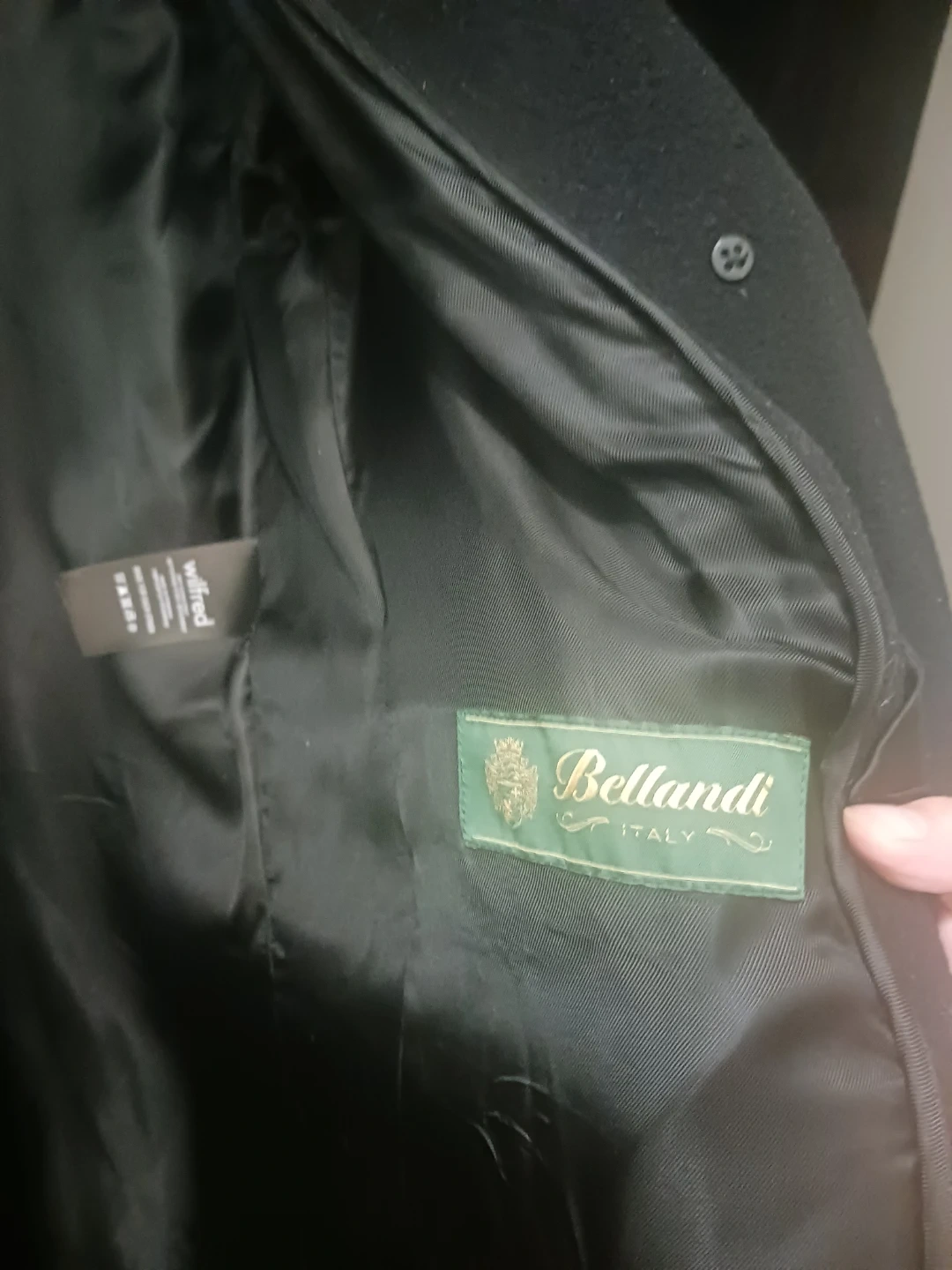 This Wilfred "The Cotton Coat" is handcrafted with virgin wool and cashmere from Italy. It features a classic fit and vegan chamois lining. The Bellandi fabric is from Italy.