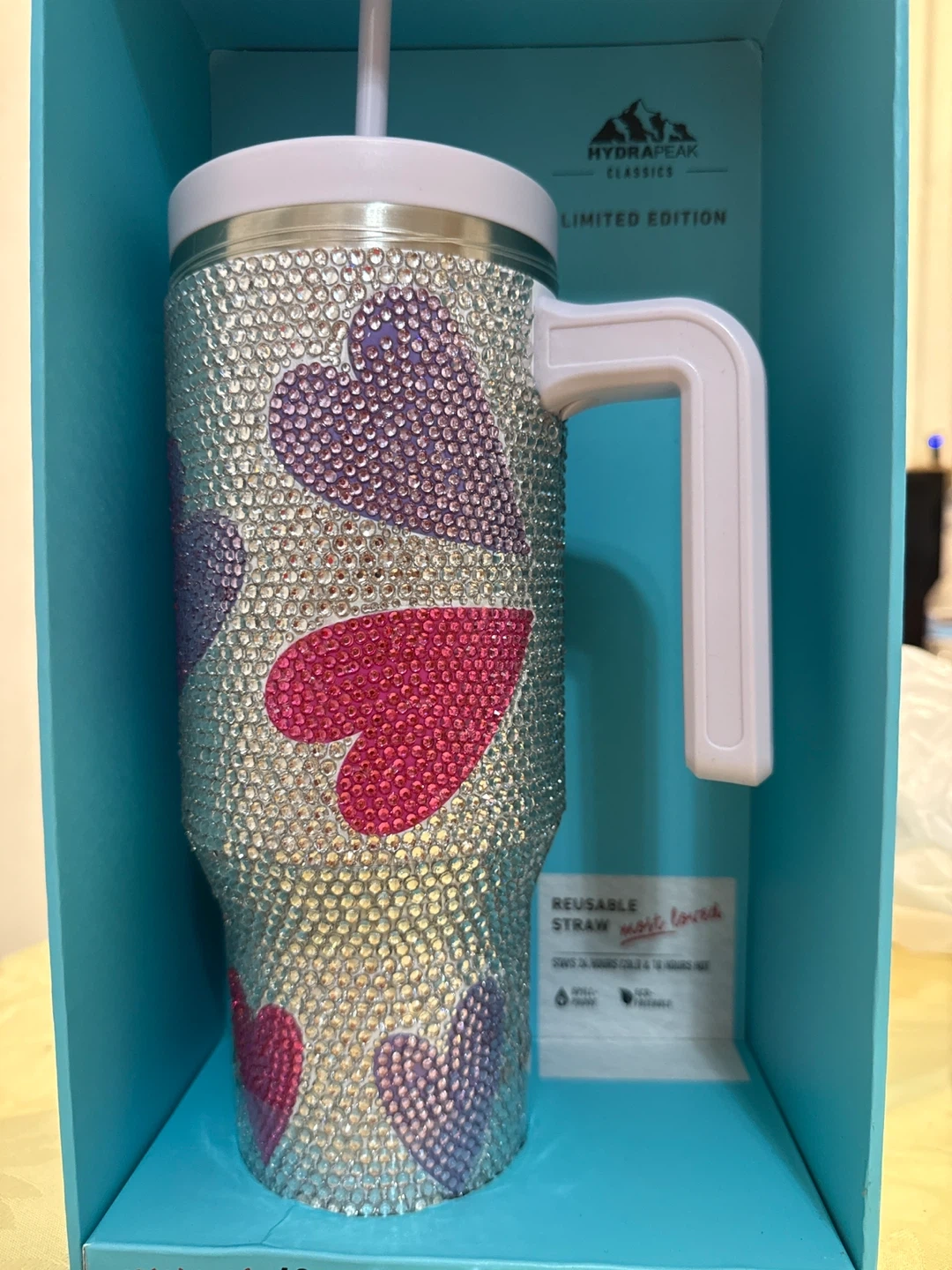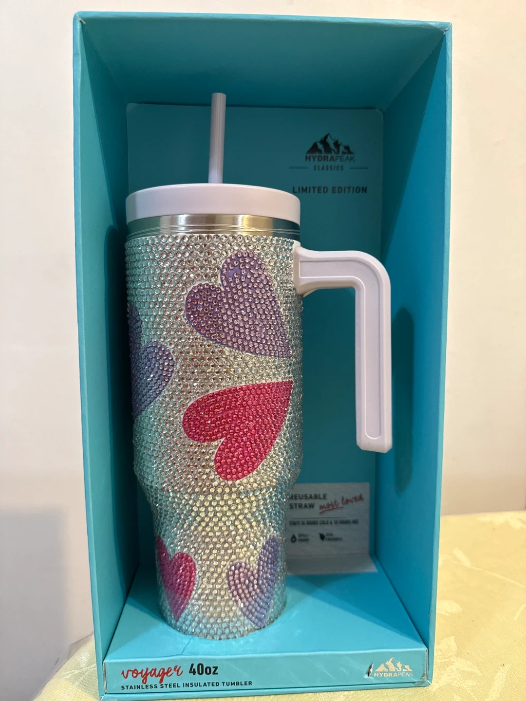 This is a dazzling HydraPeak Voyager 40oz stainless steel insulated tumbler from their limited edition collection. It's adorned with sparkling rhinestones and charming heart designs in pink and purple. It includes a reusable straw and its original box.